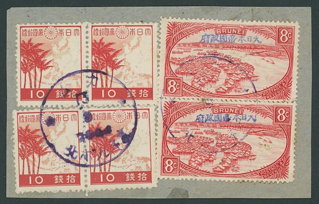 1942 8c. red (2) with scarce pale blue overprint in combination with unoverprinted Showa 10c. red pairs (2), all tied to piece by Mukah "13/9/2604" JD3 datestamp (a new latest known date of use by six weeks)