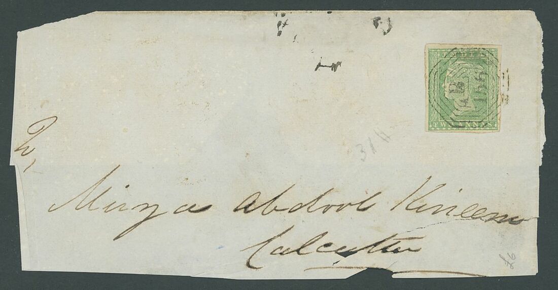 Part of letter addressed to India bearing 1854 2a. tied by Rangoon "B/156" obliterator in black, stamp with four complete margins, piece with some faults, nevertheless a scarce usage.