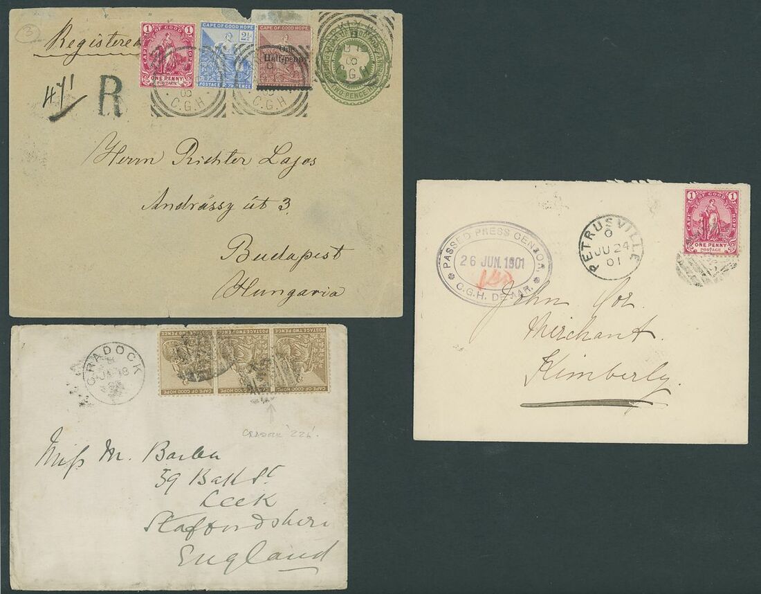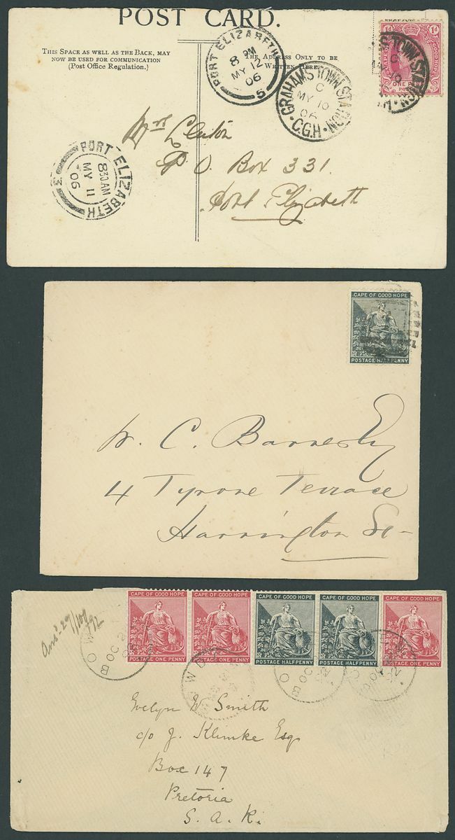 A small group of covers and postcards (6) including 1892 envelope to Pretoria bearing ½d. (2) and 1d. (3) tied by