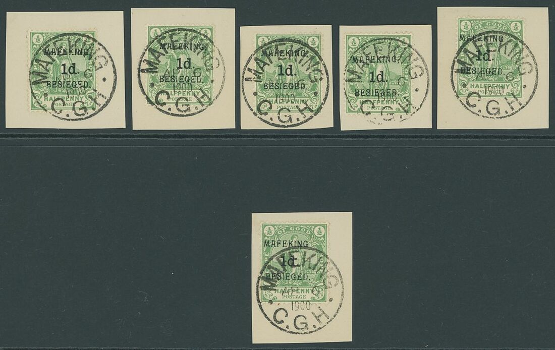 1900 1d. on ½d. green, six examples from the six positions of the setting (position 5 and 6 show 'no comma'), all used on individual pieces by matching strikes of "