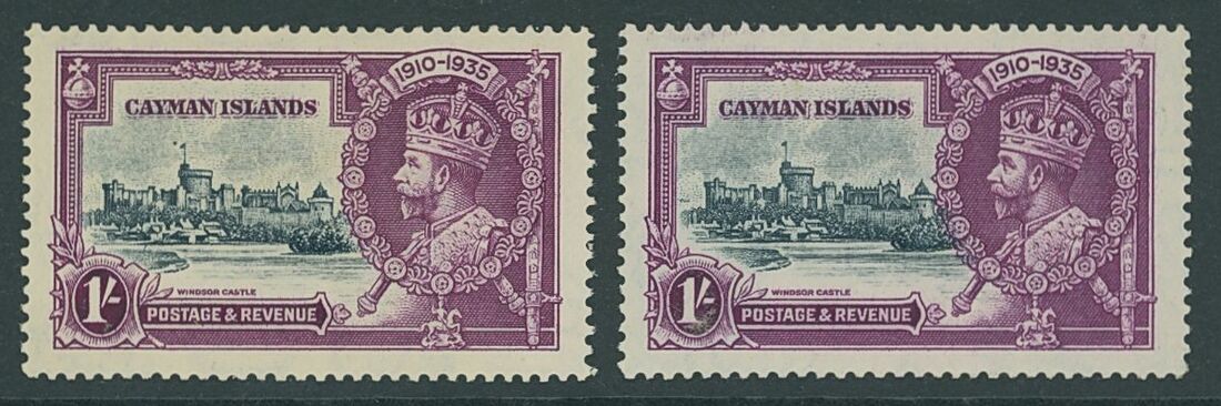 1935 1/- slate and purple (2) showing variety dot by flagstaff and dash by turret, mint large part original gum, the first with off white gum otherwise fine. S.G. 111h, 111i, £1,100