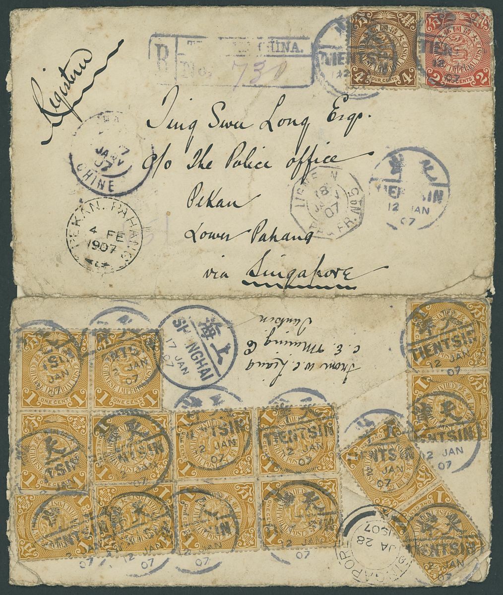 1907 (12 Jan.) envelope registered from Tientsin to Pekan, Pahang bearing CIP coiling dragons 1c. (14), 2c., 4c. cancelled by despatch c.d.s., the envelope travelled via Shanghai (17.1), through sea carried on 'Salazie' showing 'Ligne n paq 5' (18.1), then Singapore (28.1) and arrival (4.2). Envelope with some faults, opened for display and reinforced on the back, though an impressive franking to a scarce destination.