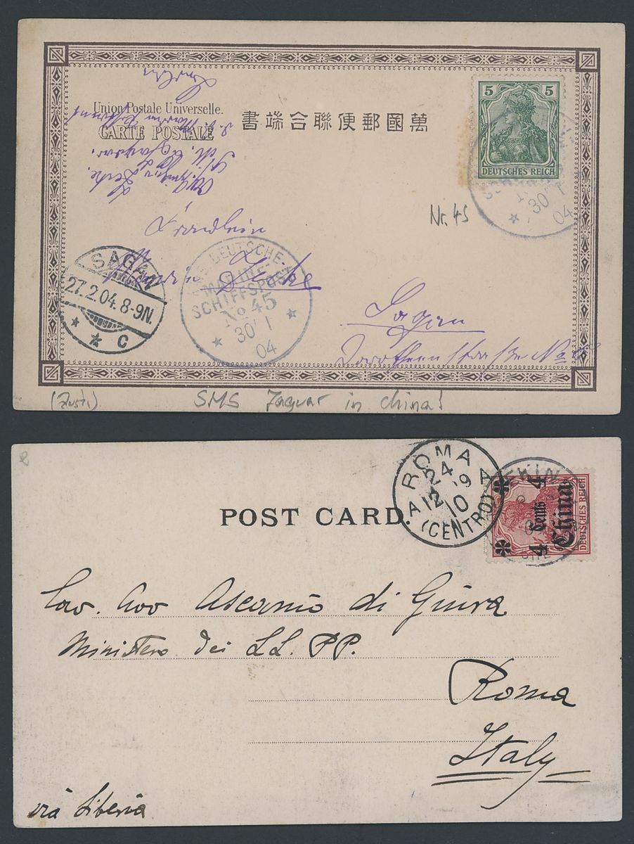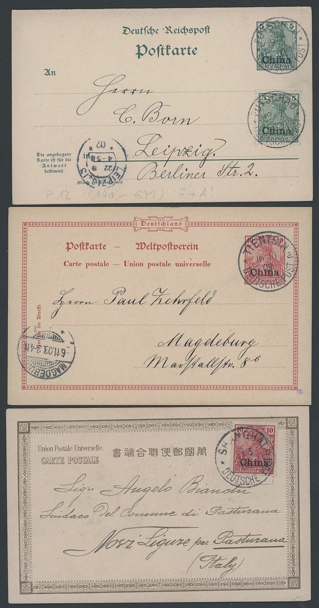 1902-10 postal history selection including 1902 5pf. stationery double card uprated with 5pf. from Futschau; 1903 10pf. stationery to Germany; 1904 Germany 5pf. on postcard cancelled by