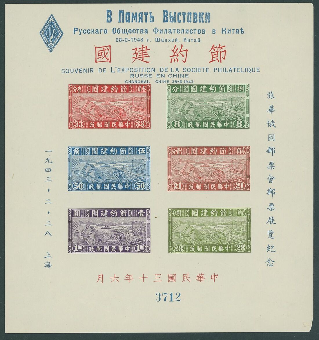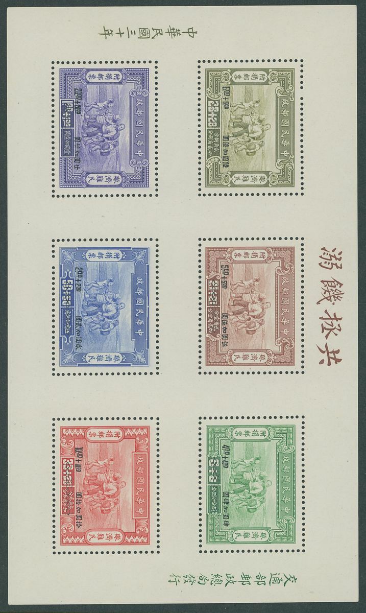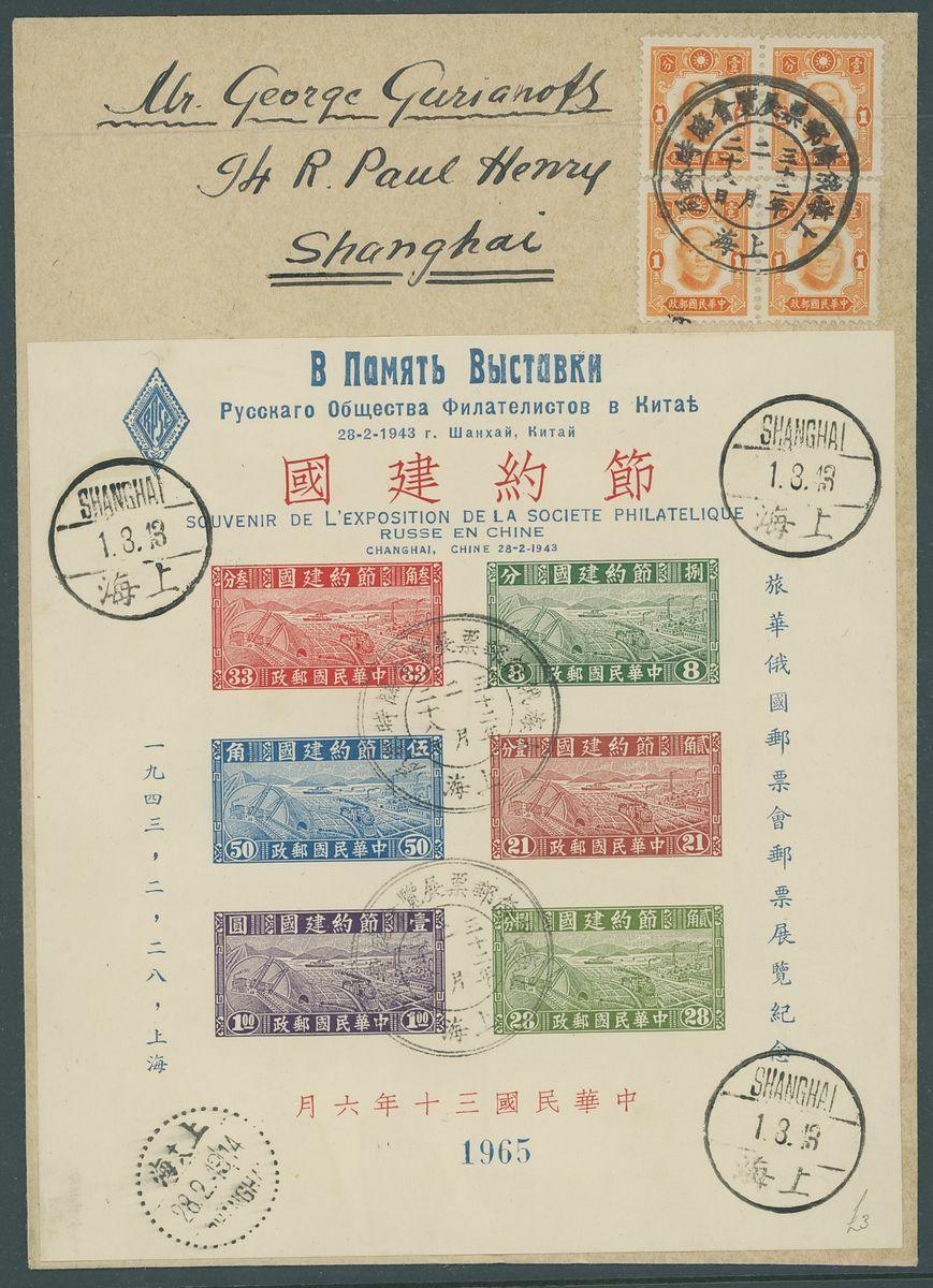 1941-44 miniature selection (4) including 1941 The Thrift Movement miniature sheet unused and 1943 overprinted for stamp exhibition (2, one on envelope addressed to Shanghai), 1944 Refugees Relief miniature sheet unused, mixed condition.