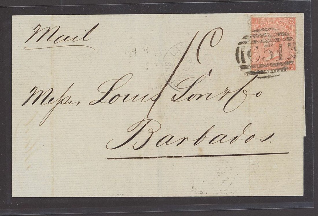 1866 (16 Mar.) entire letter to Barbados, bearing GB 1865 4d. vermilion plate 7 tied by neat "C51" obliterator, showing manuscript "1" and with faint despatch c.d.s. The reverse with arrival (13.3) c.d.s. A couple of usual archive folds still an attractive item.