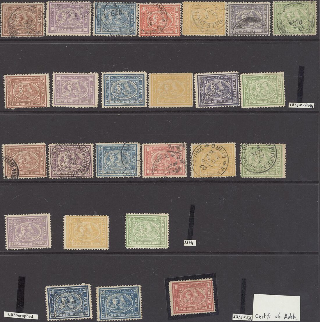 1872 unused and used selection (25) arranged on a hagner page including Litho 1pi. unused with Egypt Study Circle certificate (1978), Typo perf. 12½x13¼ to 5pi. used, to 5pi. (no 1pi.) unused and perf. 13¼ to 5pi. (no 2½pi.) used and 10pa., 2pi. and 5pi. unused with scarce 5pi. with Hass certificate (1997). Mixed condition, a useful group.