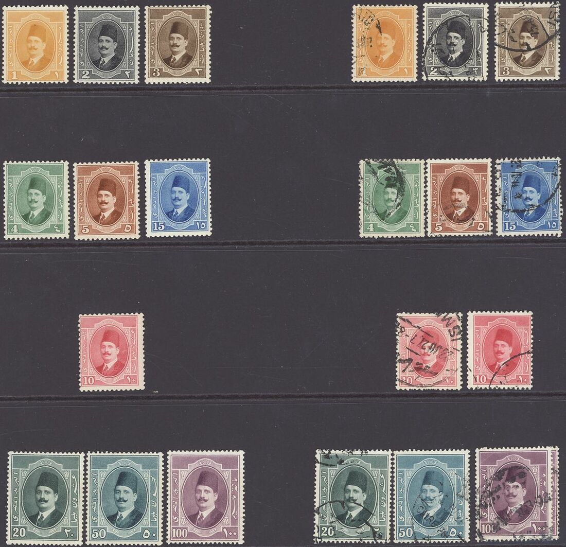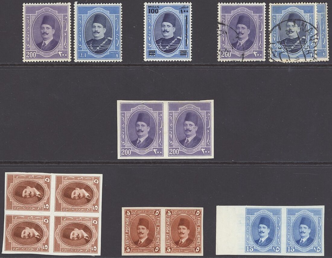 1922-24 selection arranged on a page including 1922 Essay 5m. brown imperf pair on gummed watermarked paper, 15m. blue imperf pair on gummed watermarked paper. 1923-24 1m. to £1 mint, 200m. imperf pair mint. Mixed condition, a pleasant addition for the King Fuad collector.