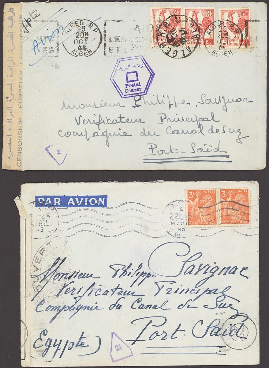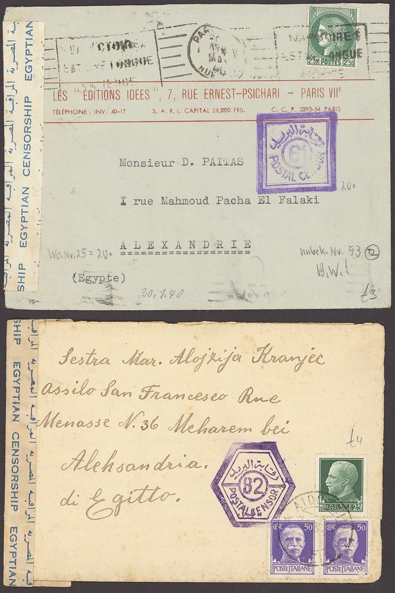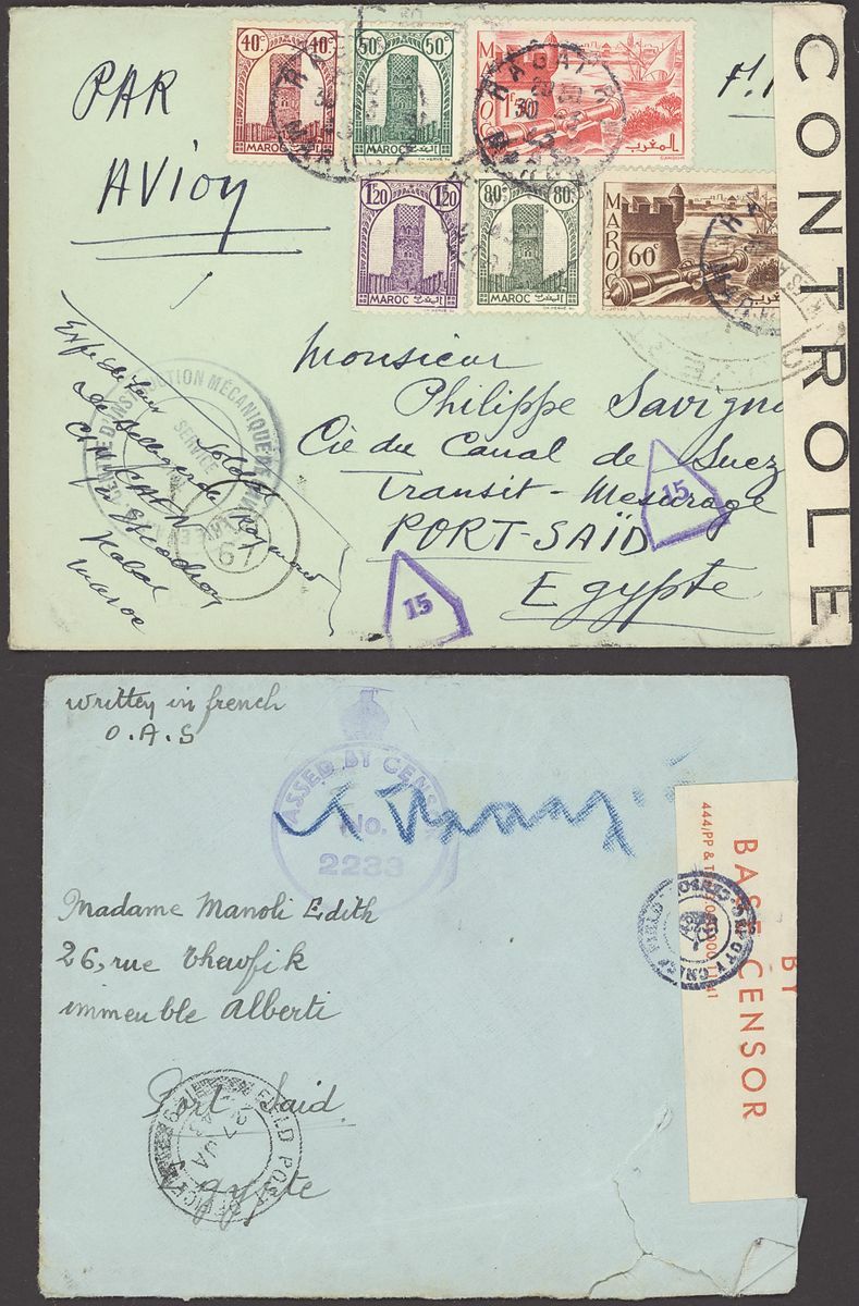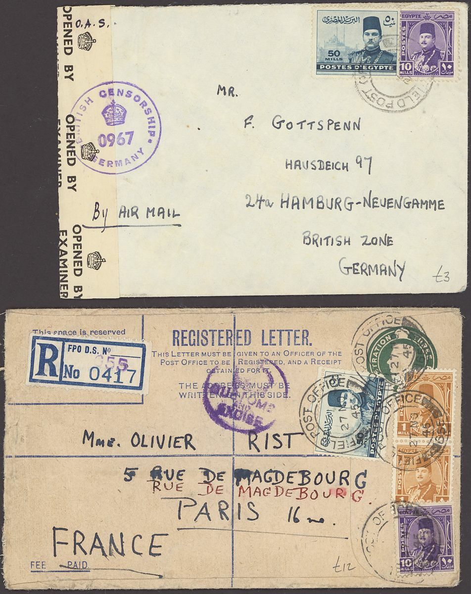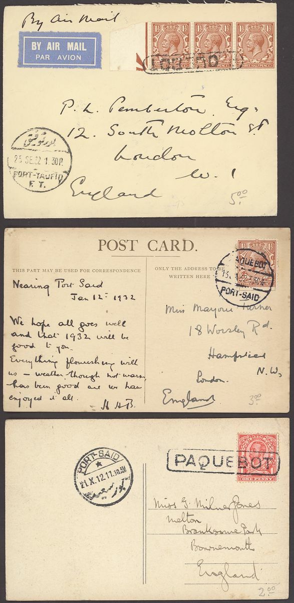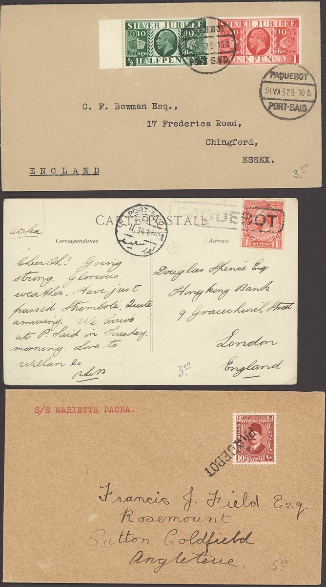 1855-1950s postal history selection (80+) including 1855 stampless entire from Alexandria to Leghorn, 1856 small size envelope from Suez, range of Paquebots including 1937 pre-printed