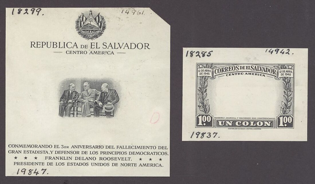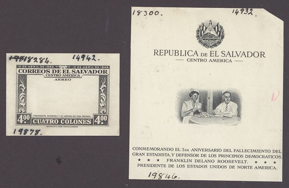1948 'Roosevelt' separate Waterlow die proofs in black for the stamp frames and the vignetted with surrounds for the two miniature sheets. Fine and unique.