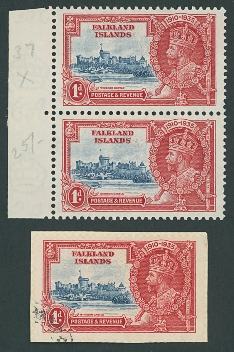 1935 1d. deep blue and scarlet variety flagstaff on right-hand turret a mint example in positional vertical pair and a used example on small piece, fine. S.G. 139, 139d, £800