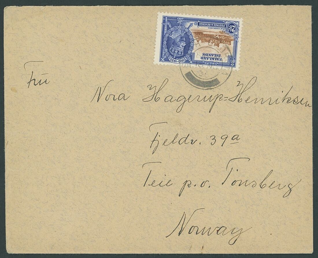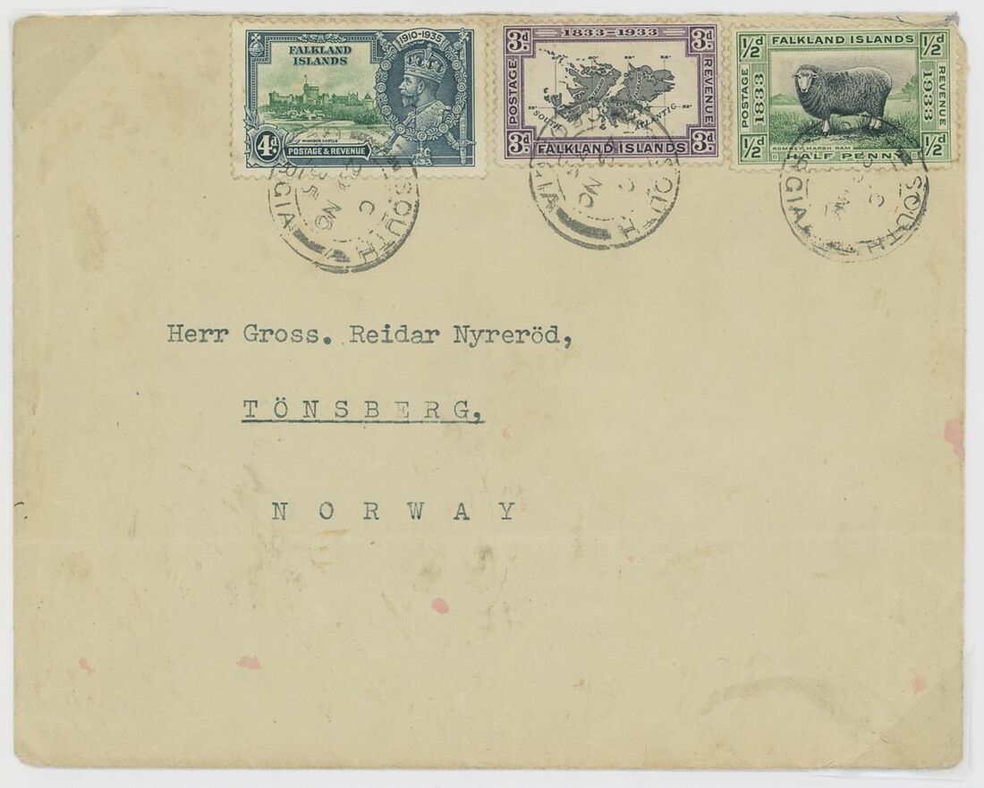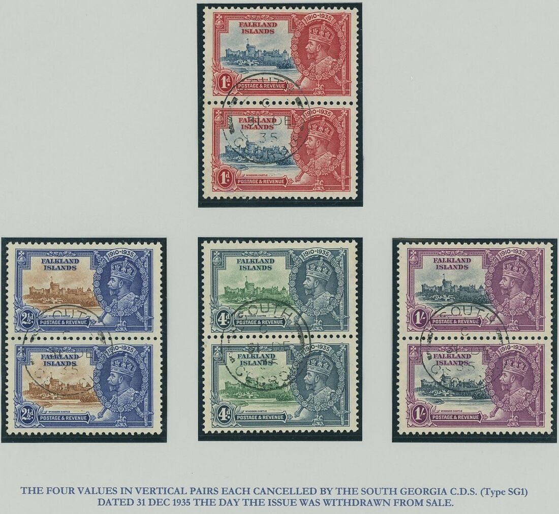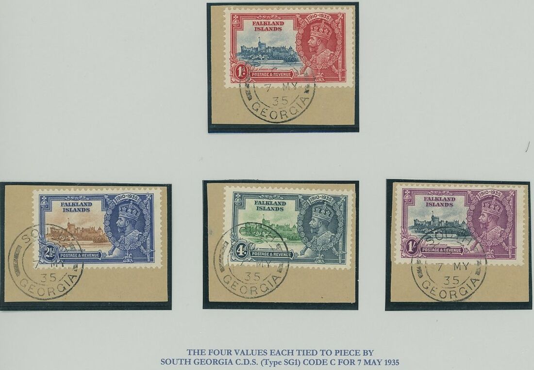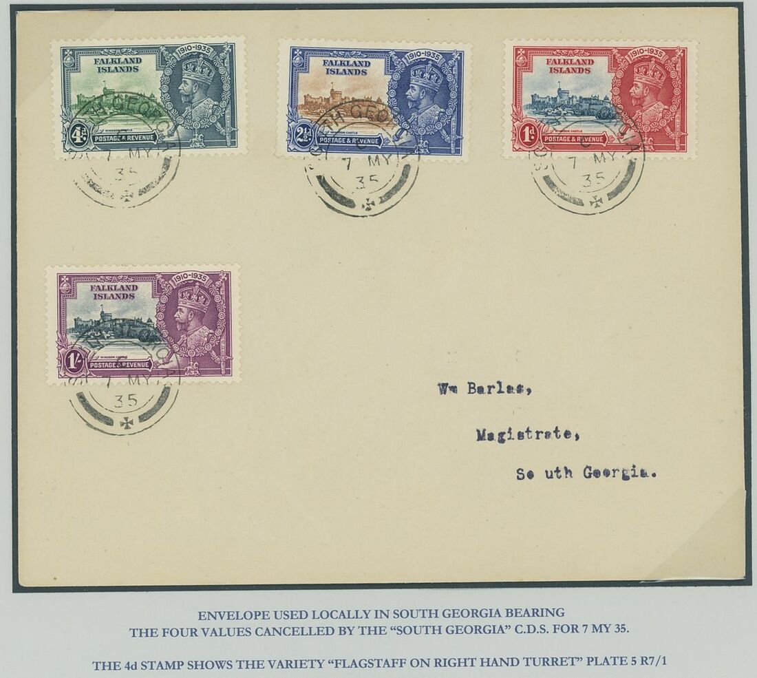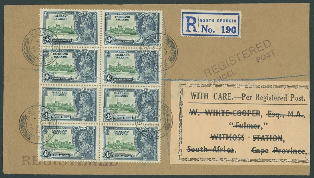 1935 Silver Jubilee selection used in South Georgia including set cancelled on First Day (7.5) on pieces; set in vertical pairs cancelled by Last Day (31.12) c.d.s.; local envelope bearing the set with the 4d. showing variety flagstaff on right-hand turret cancelled by First Day c.d.s.; registered parcel post envelope to South Africa bearing 4d. block of four (2x4) cancelled by despatch (10.11) c.d.s, forwarded to England with the postage paid by South Africa 2d. (2) and 3d. (2); Whaling cover to Norway bearing 2½d. cancelled by despatch (18.11) c.d.s.; Whaling cover bearing 4d. uprated with centenary ½d. and 3d. cancelled by despatch (29.11) c.d.s. A useful group for the specialist.