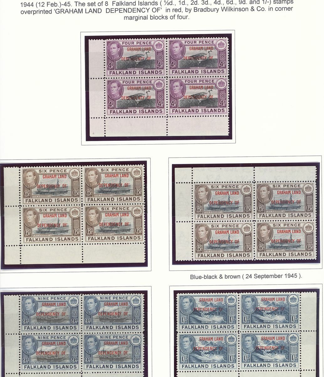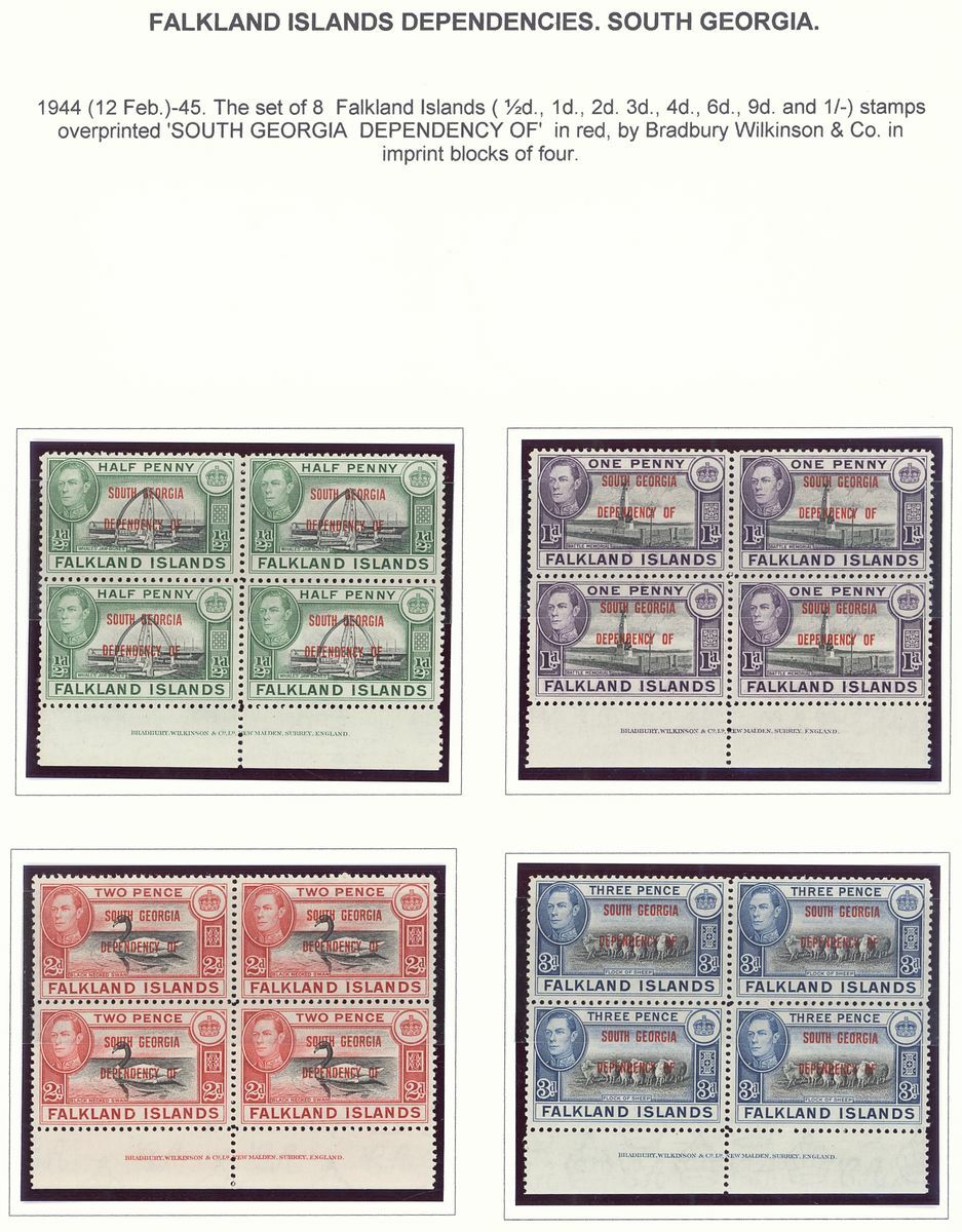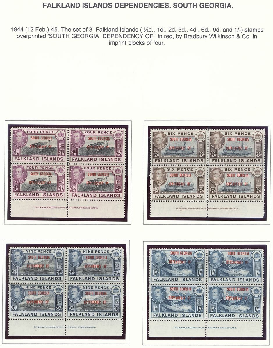 1944-48 mint group of multiples comprising 1944-45 overprint sets of eight for Graham Land and South Georgia each in an imprint block of four, 1946 Thick Map set of eight each value in a block of nine from the corners of the sheets and 1946 Thin Map set of nine each value in an imprint block of four; fine unmounted mint. S.G. cat. value £650+