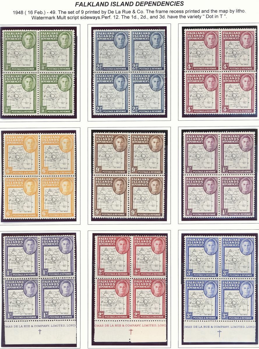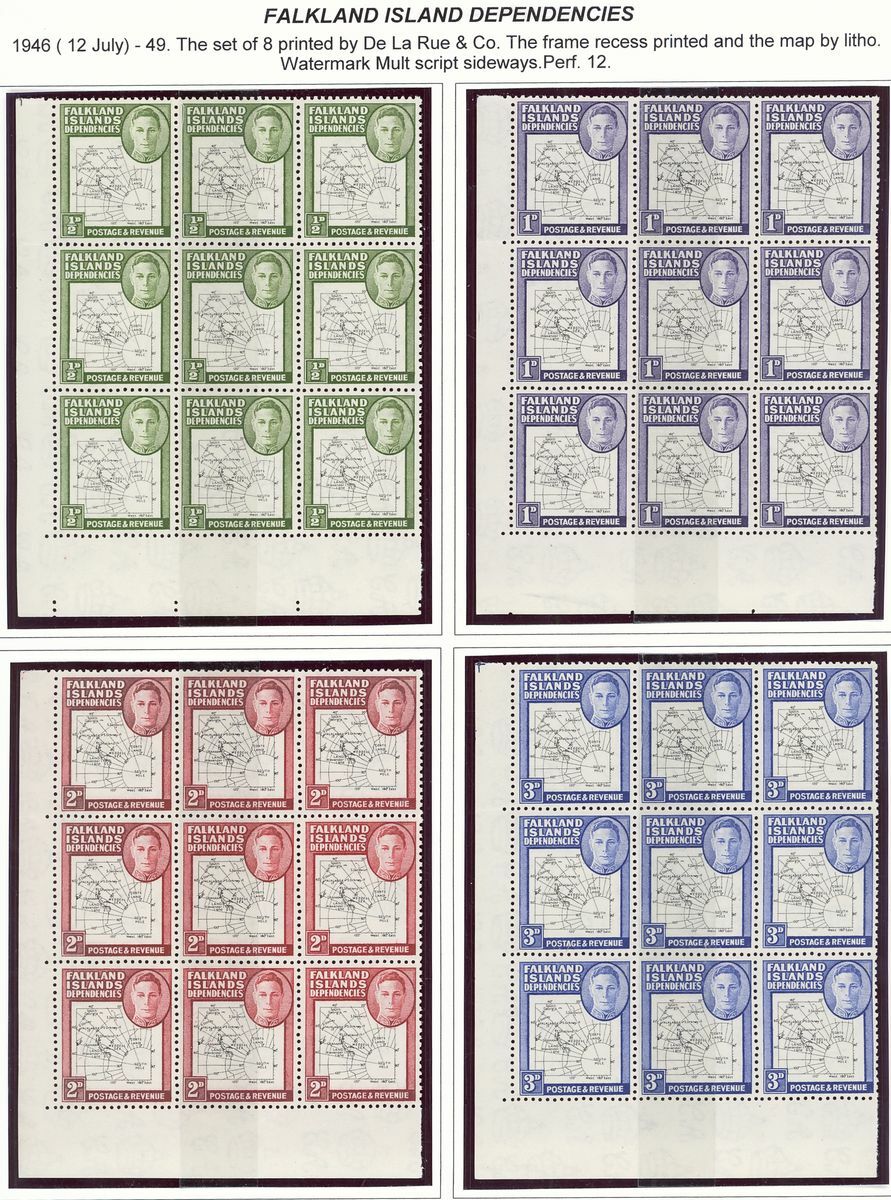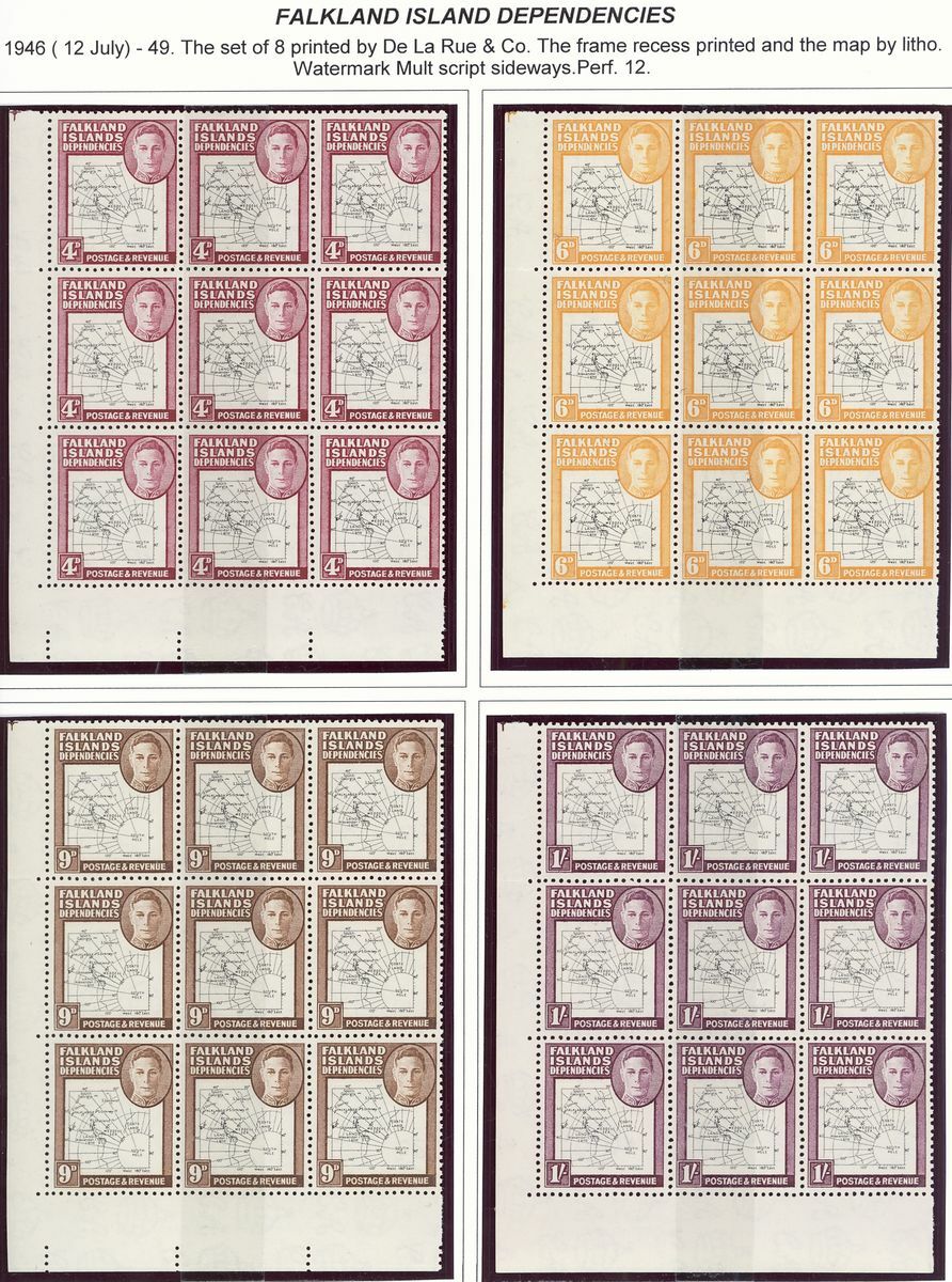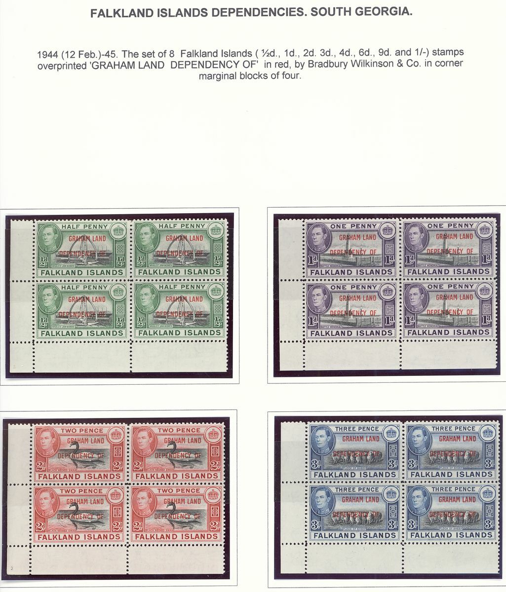 1944-48 mint group of multiples comprising 1944-45 overprint sets of eight for Graham Land and South Georgia each in an imprint block of four, 1946 Thick Map set of eight each value in a block of nine from the corners of the sheets and 1946 Thin Map set of nine each value in an imprint block of four; fine unmounted mint. S.G. cat. value £650+