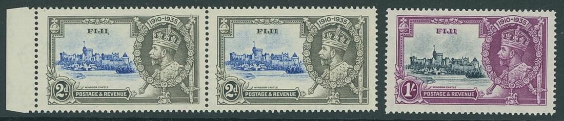 1935 Silver Jubilee variety diagonal line by turret 2d. ultramarine and grey horizontal pair showing both variations of the variety and 1/- slate and purple, fine unmounted. S.G. 243f, 245f, £615