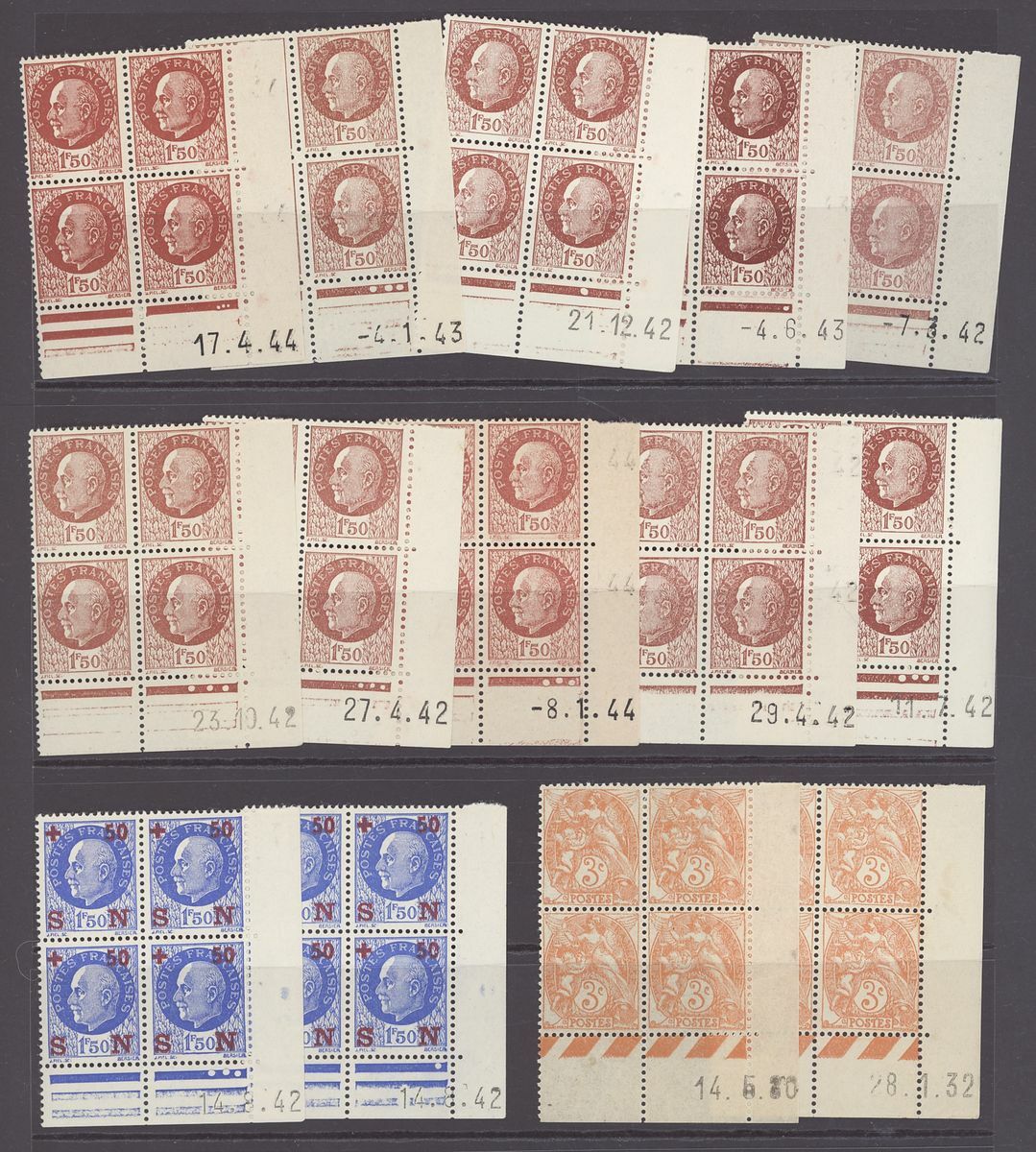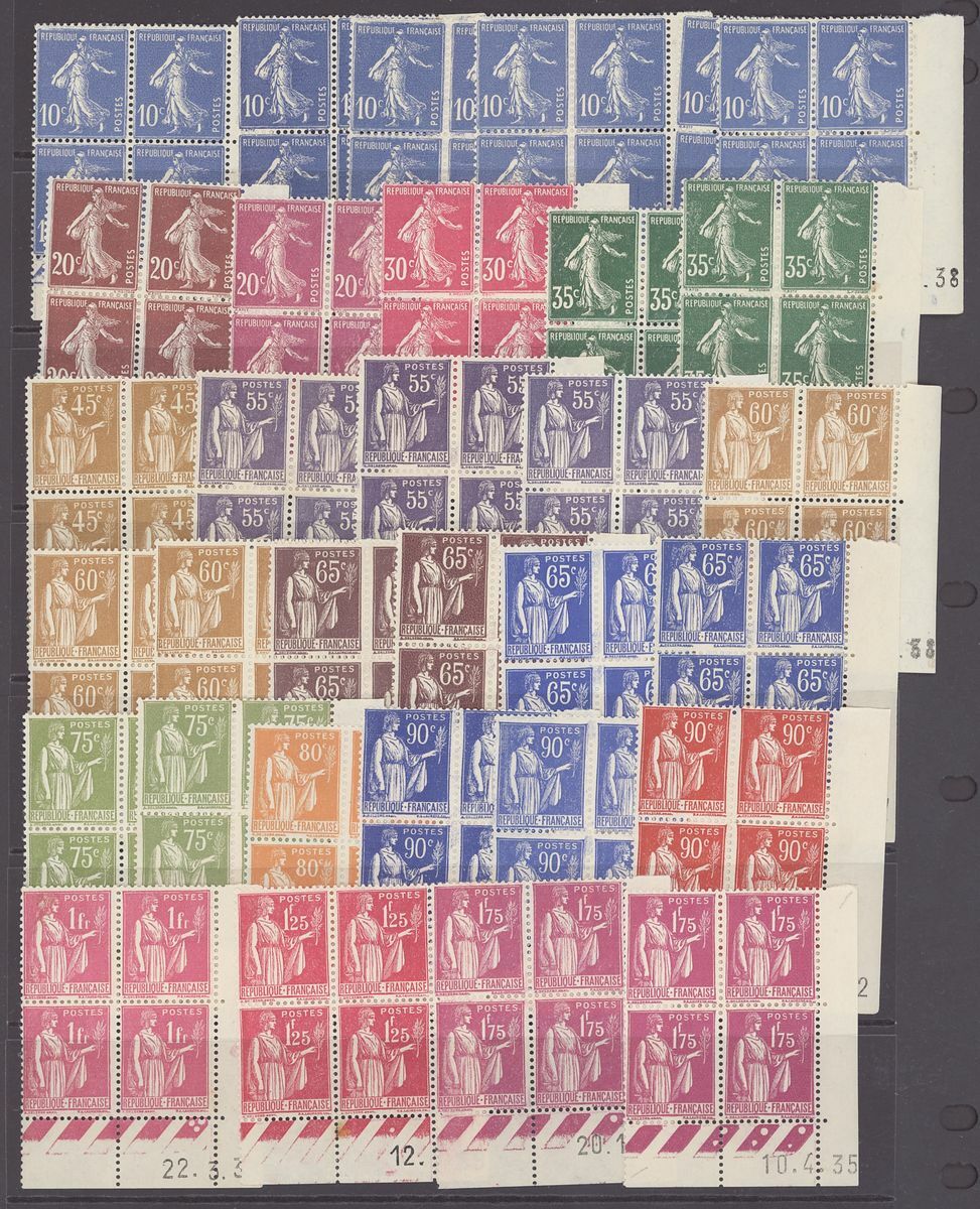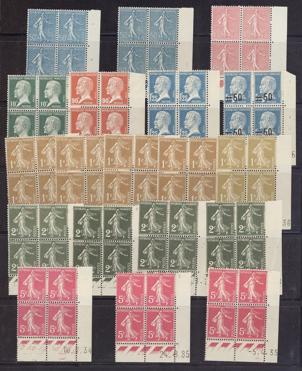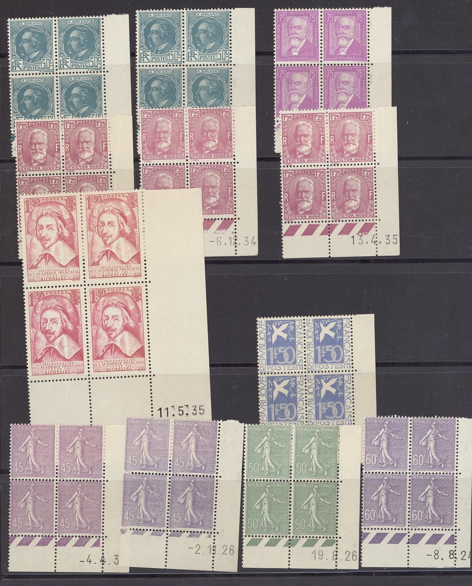 1920-44, selection of 140+ Coin daté blocks of four, including 1920-26 Sower 60c., 1923-26 Pasteur 90c., 1f. 25f., 1925-32 Sower 45c. (2), 50c., 1933 Personalities 30c.(2), 75c., 1f. 25 (3), 1934 Peace 1f. 50, 19345 Richelieu 1f. 50, etc., unmounted mint, chiefly fine, also 1923 2f. Pasteur (series 44) and Peace 10f. (series 277) booklets