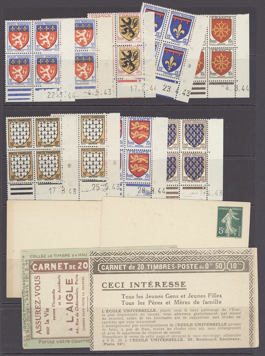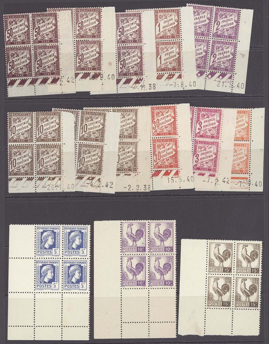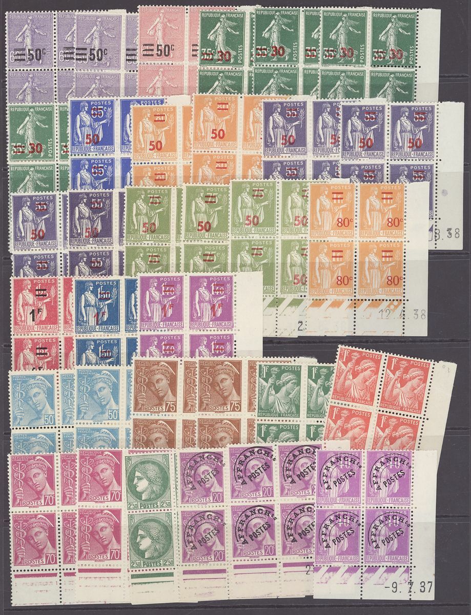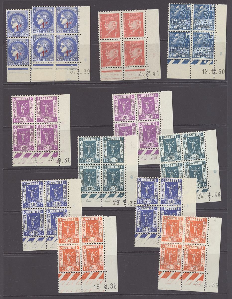 1920-44, selection of 140+ Coin daté blocks of four, including 1920-26 Sower 60c., 1923-26 Pasteur 90c., 1f. 25f., 1925-32 Sower 45c. (2), 50c., 1933 Personalities 30c.(2), 75c., 1f. 25 (3), 1934 Peace 1f. 50, 19345 Richelieu 1f. 50, etc., unmounted mint, chiefly fine, also 1923 2f. Pasteur (series 44) and Peace 10f. (series 277) booklets