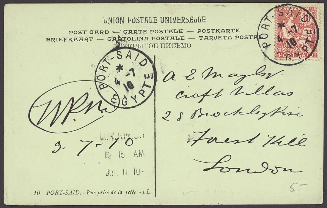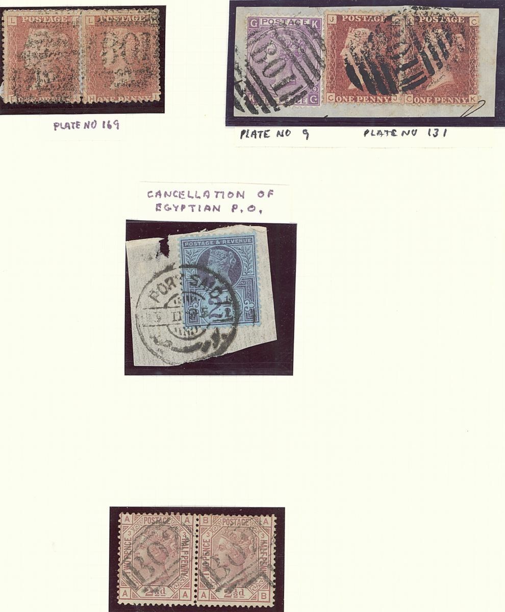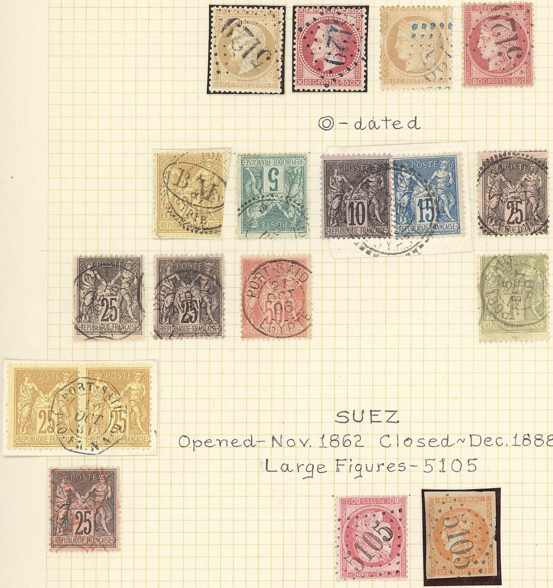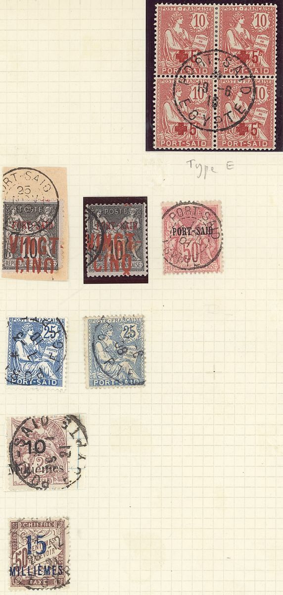 1867-1910 selection on four pages including French stamps cancelled by '5129' obliterator (4), '5105' (2), c.d.s. (12), also Port-Said stamps (12, one on postcard) showing various type of c.d.s. In addition, GB stamps cancelled by 'B01' (5), 'B02' (2) and an 1887-92 2½d. cancelled by Egyptian Port-Said c.d.s. Mixed condition, a nice addition for the student of the area.