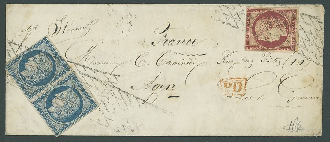 1852, envelope from St. Pierre to Agen, on arrival franked by France 1849-52 25c. blue pair and 1f. carmine with Paris grill sans fin cancellations, transit and arrival markings on the reverse; the adhesives with some faults but an attractive and rare franking. Photo