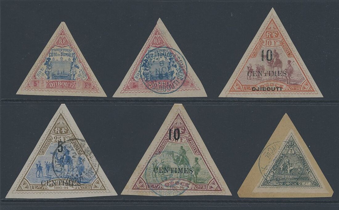 1893-1902 high values selection (6) on a stockcard including Obock 1893-94 2f. used on piece, Somali Coast 1894-1900 5f. (2, one mint), 1902 10c. on 10f.
