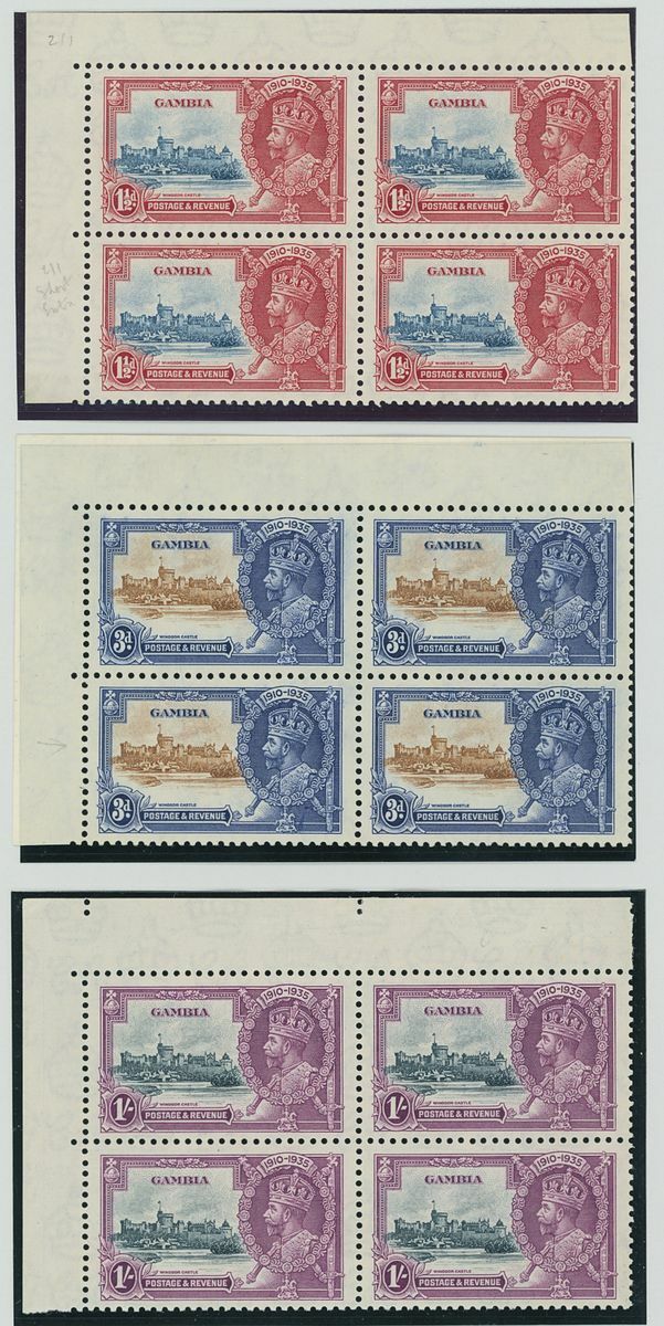 1935 1½d., 3d. and 1/- each in upper left corner block of four with the lower left stamp showing variety short extra flagstaff unmounted mint with characteristic off white gum, the 1/- block mounted on top margin only. Fine and scarce positional blocks. S.G. 143,144, 146, 143b, 144b, 146b, £1,050++. Photo