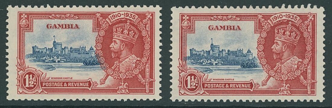 1935 1½d. deep blue and scarlet variety mint duo including lightning conductor unmounted and double flagstaff mounted, fine and scarce. S.G. 143c, 143e, £1,100