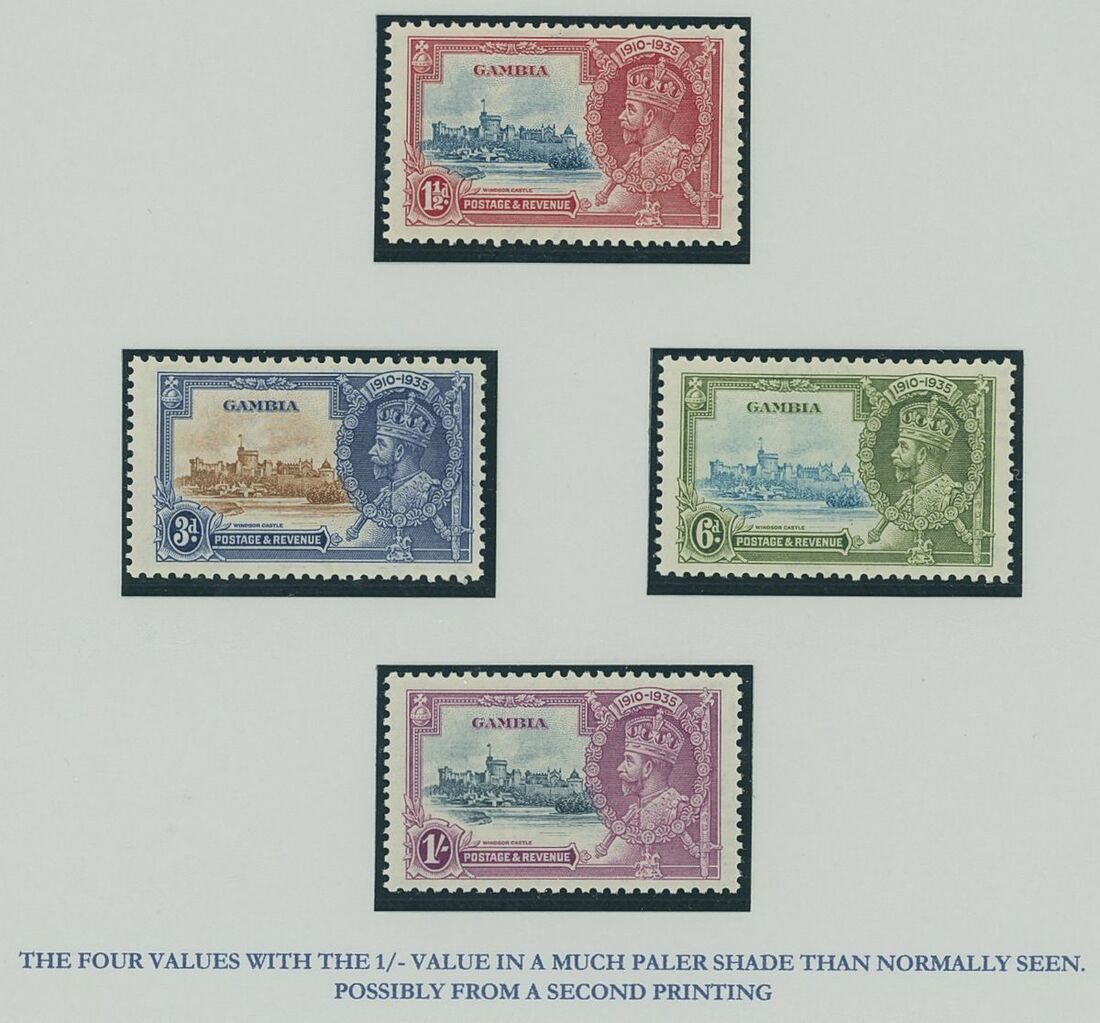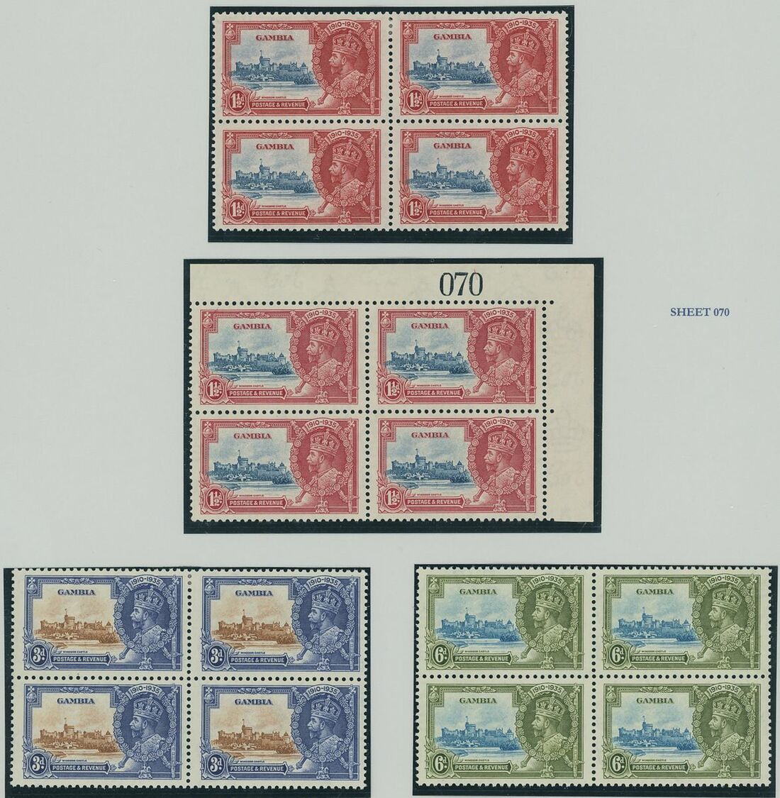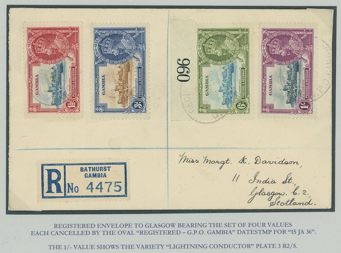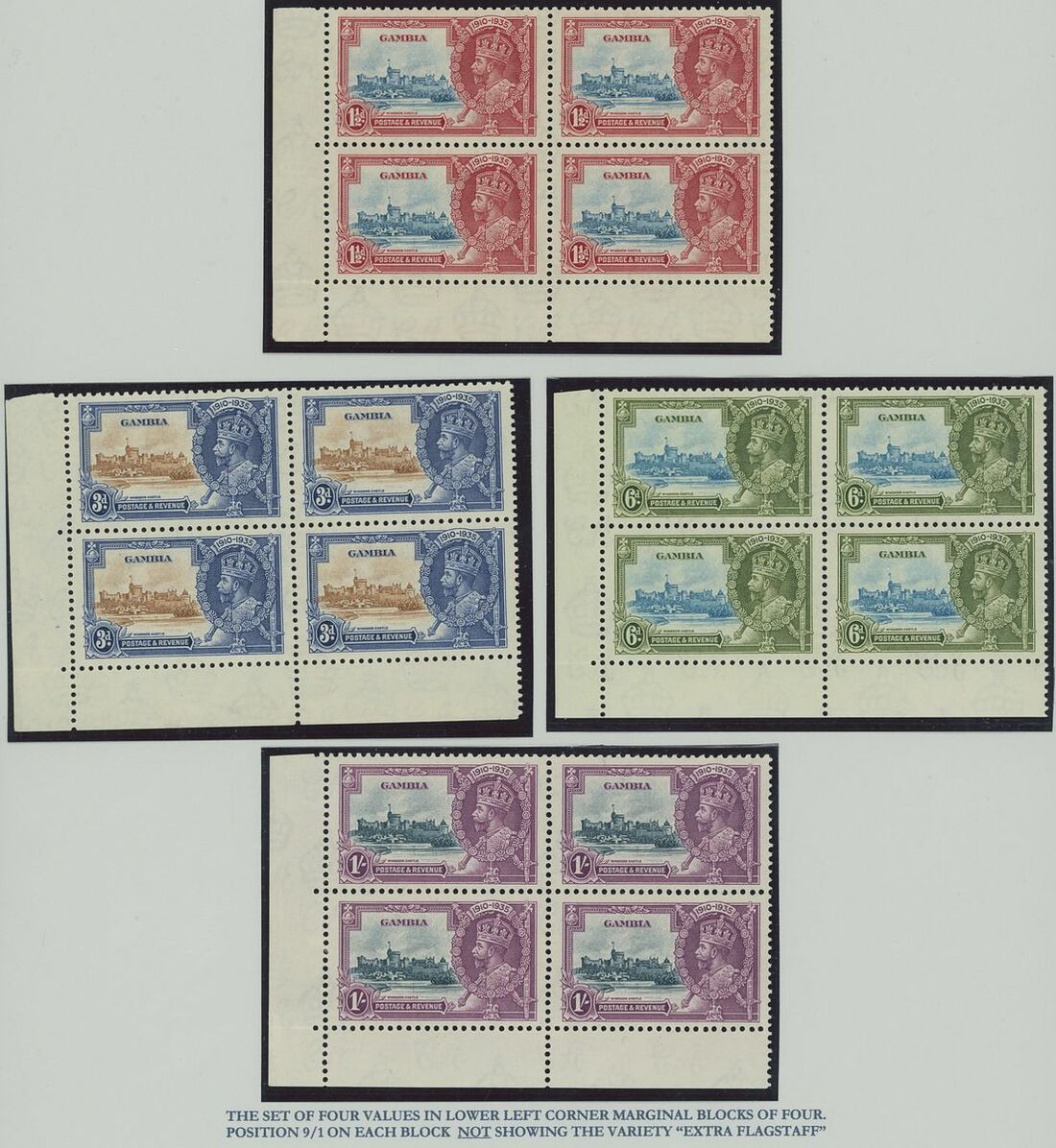 1935 Silver Jubilee selection including 1½d. to 1/- set of four, lower left corner block of four not showing the variety extra flagstaff mint; additional set with the 1/- in much paler shade mint; envelope registered to Scotland bearing the full set with the 1/- showing variety lightning conductor, generally fine.
