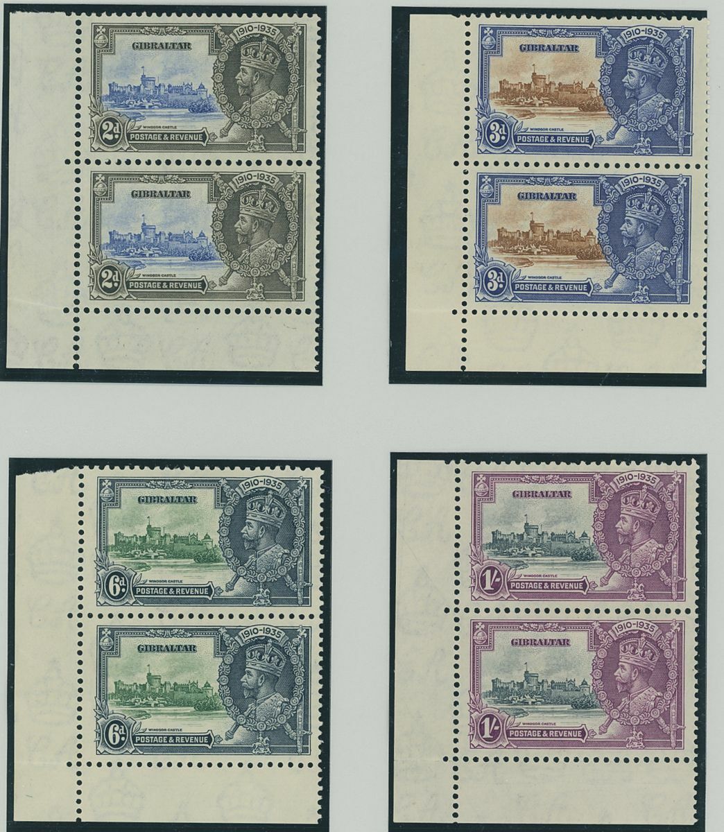 1935 2d. to 1/- set of four each in lower left corner vertical pair with the upper stamp showing variety extra flagstaff unmounted mint, mounted in the margin only, fine and scarce positional pairs. S.G. 114-117, 114a-117a, £900+