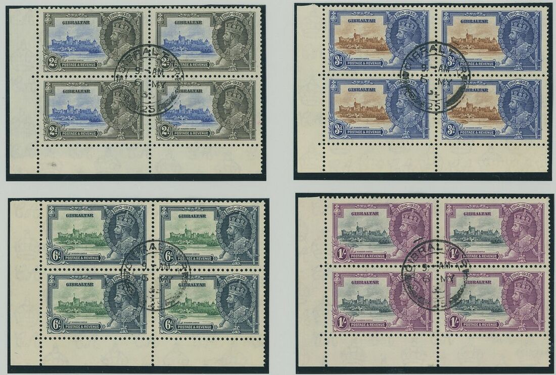 1935 2d. to 1/- set of four each in lower left corner block of four with the upper left stamp showing variety extra flagstaff each block centrally cancelled by Gibraltar First Day (6.5) c.d.s., fine and attractive positional blocks. S.G. 114-117, 114a-117a, £1,130++