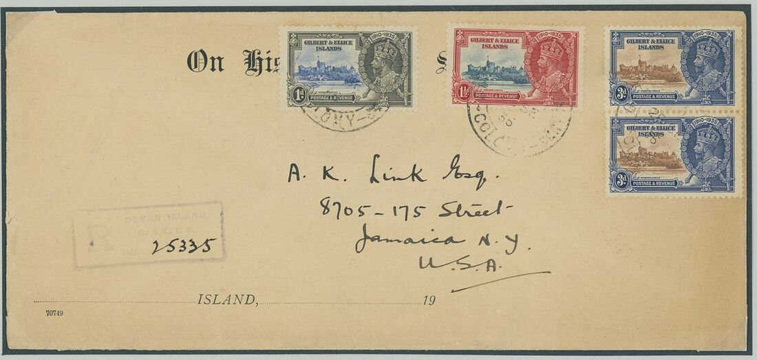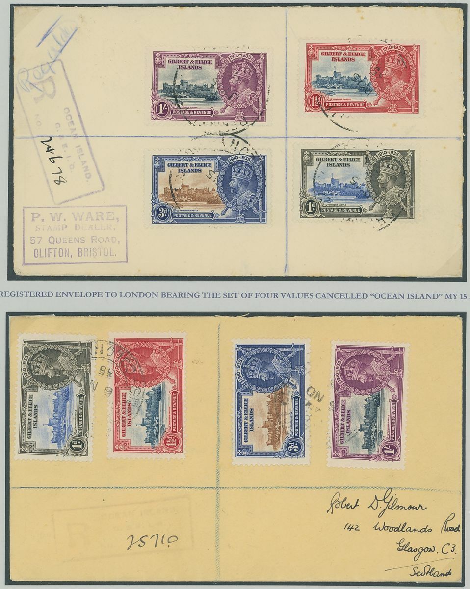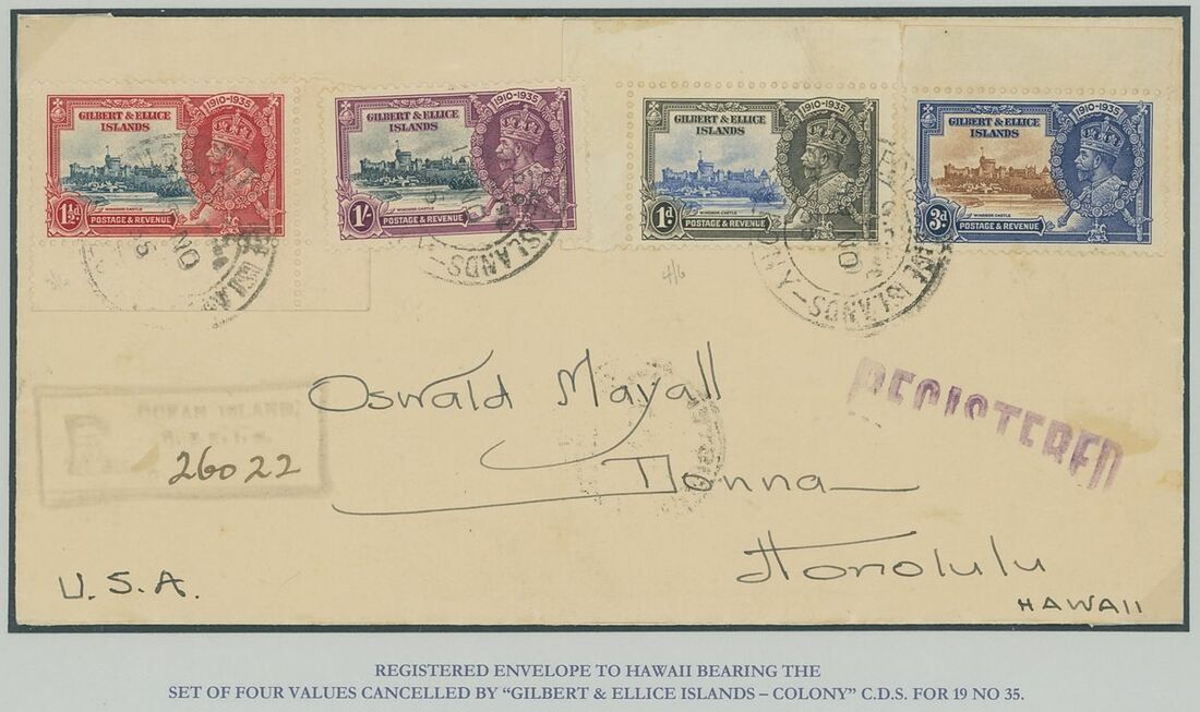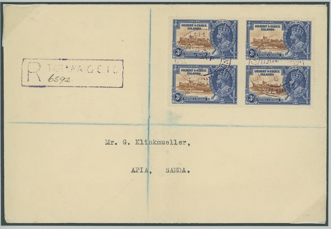 1935 Silver Jubilee a postal history selection (12, nine registered) addressed to Australia, England, Scotland, U.S.A., Canada and Samoa comprising an illustrated envelope with full set, set in blocks of four on two envelopes registered to Sydney cancelled on First Day, an attractive selection from these remote islands.