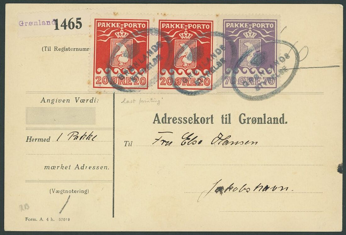 Undated Adresskort card to Jakobshavn, franked Parcel Post 20ö (pair) ad 70ö, oval (Crown)/