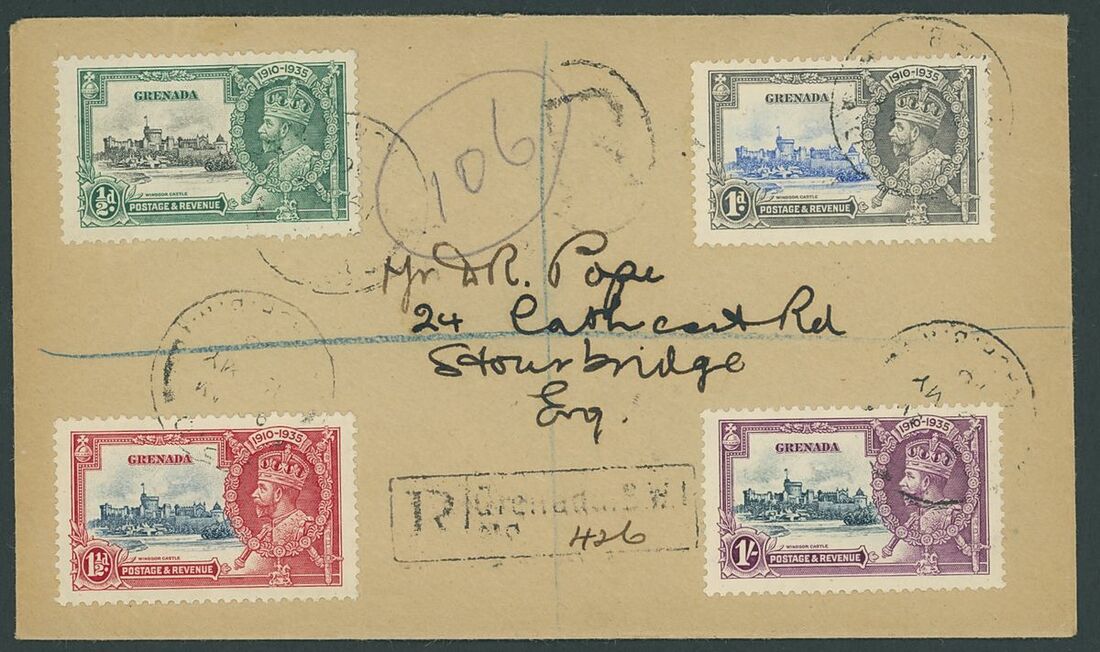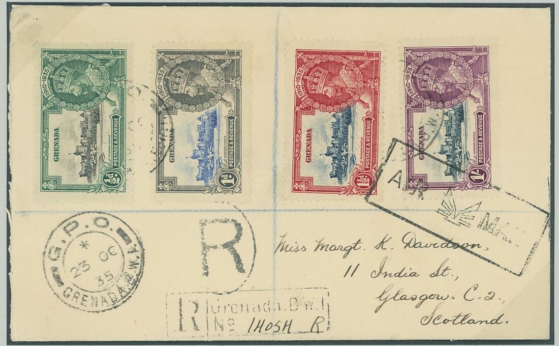 1935 Silver Jubilee variety kite and horizontal log trio including a 1/- unmounted mint; 1935 (23. Oct.) registered envelope to Scotland bearing the set with 1½d. showing the variety, 1936 (16 May) registered envelope to England bearing the set with 1/- showing the variety, generally fine. S.G. 145-148, 147l, 148l, £1,050++