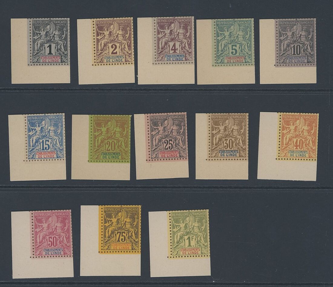1892 set of thirteen to 1f. on thick Bristol paper, each a lower left marginal example with simulated perforations; fine, without gum as produced. S.G. 1-13 var.