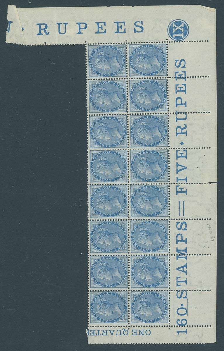 1865 ½a. blue block of sixteen (8x2) from the lower part of the sheet with margins on three sides showing inscriptions and plate number '1X', mainly unmounted mint, (two stamps mounted), block with some perforation splits and minor imperfections otherwise fine and with fresh colour. S.G. 54, £640++