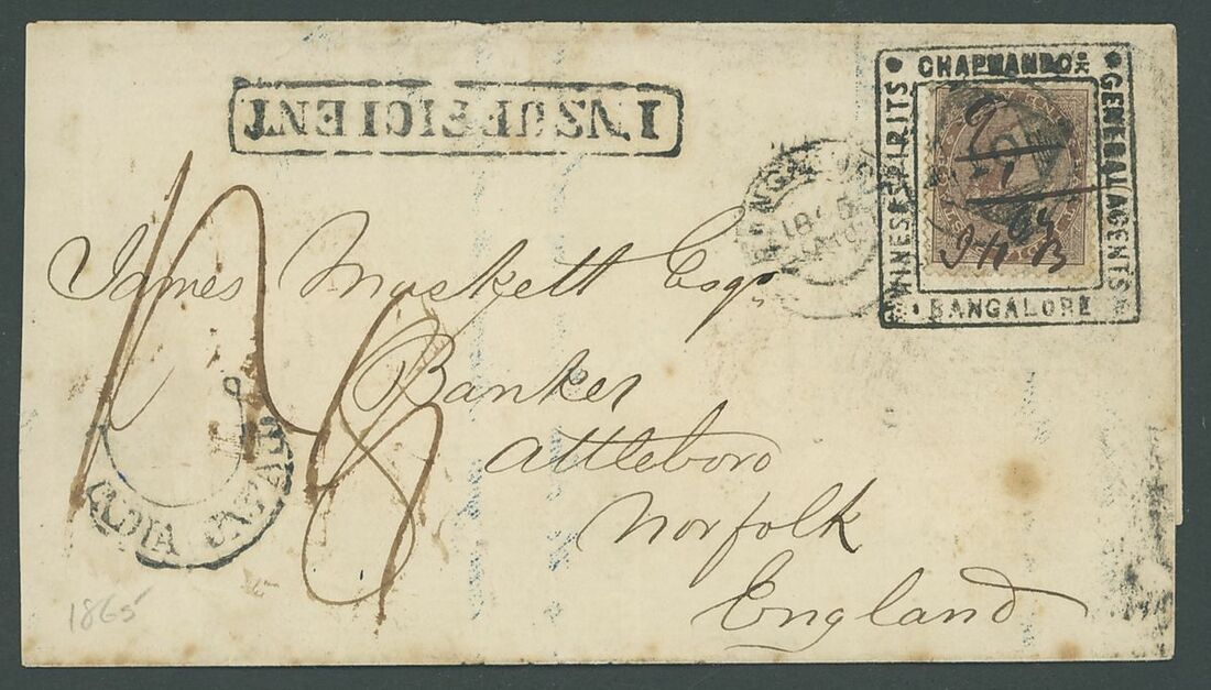 1865 (10 Jan.) wrapper addressed to England bearing 1a. and showing private advertising collar