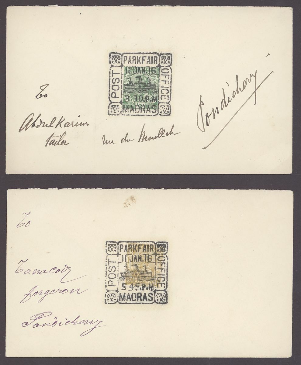 1916 (11 Jan.) two envelopes addressed to Pondicherry one bearing ½a. the other 6a. each cancelled by