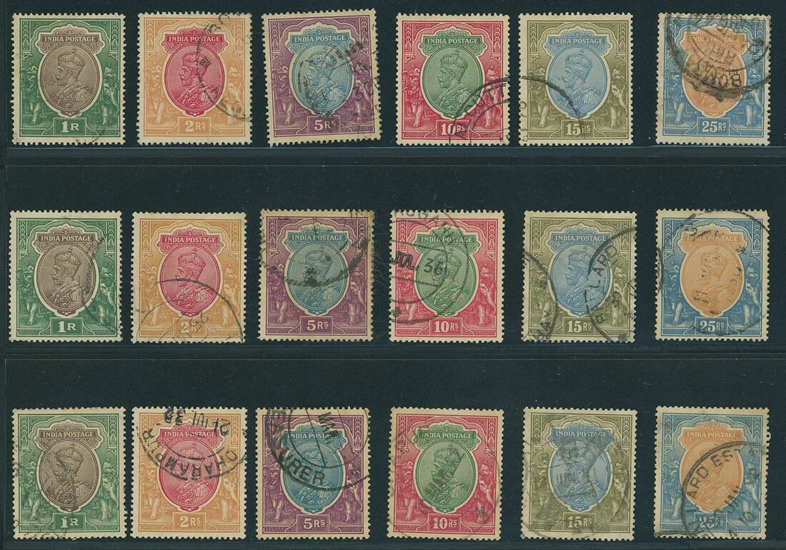 1926-33 1r. to 25r., three of each, all apparently commercially used, mostly fine. S.G. 214-219, £335+