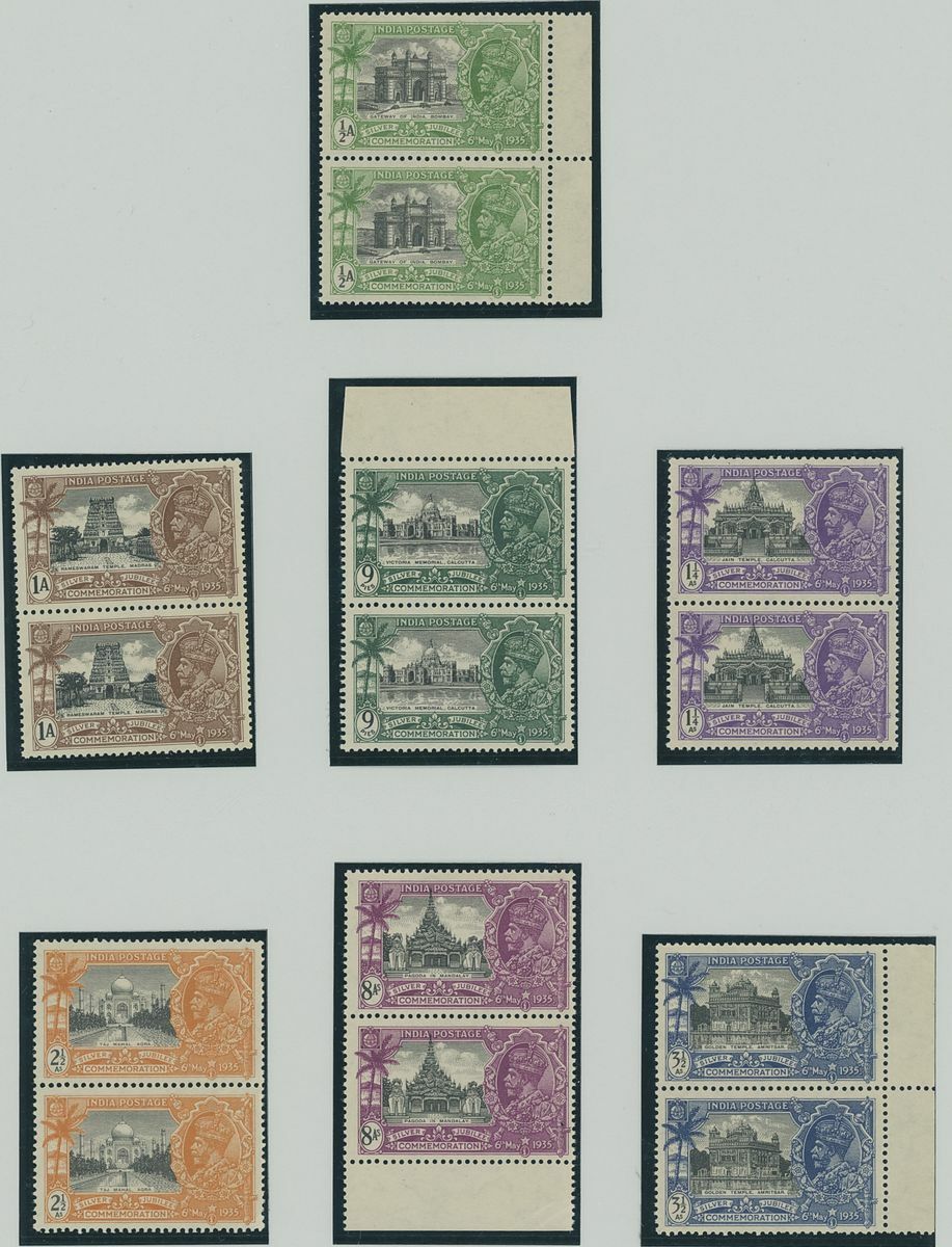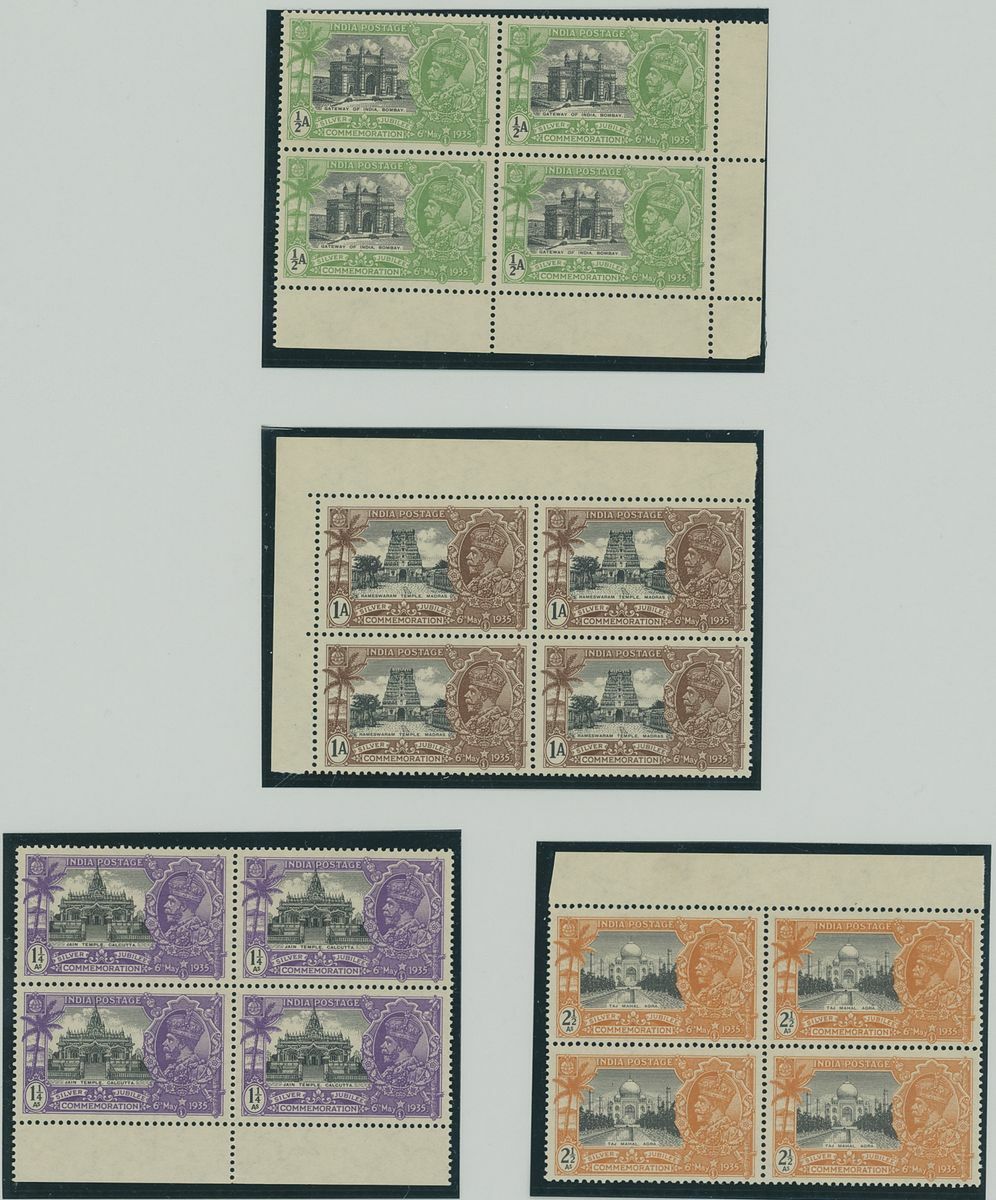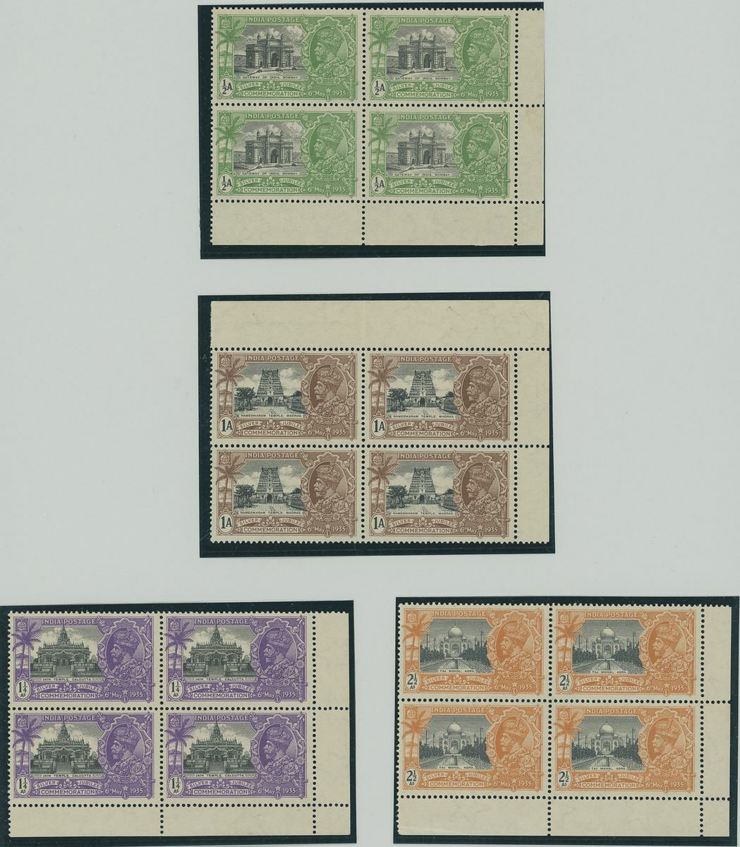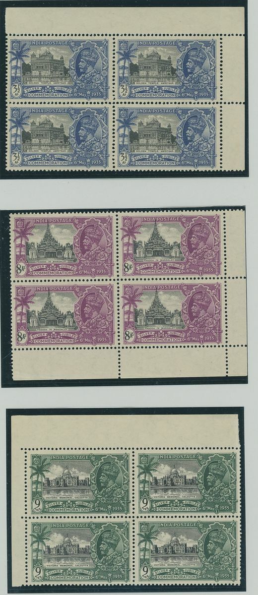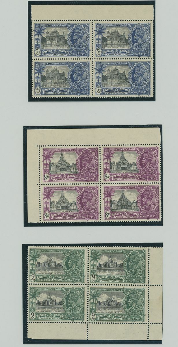 1935 Silver Jubilee ½a. to 8a. ten unmounted sets in corner blocks of four (2) and vertical pairs, generally fine. S.G. 240-246, £400