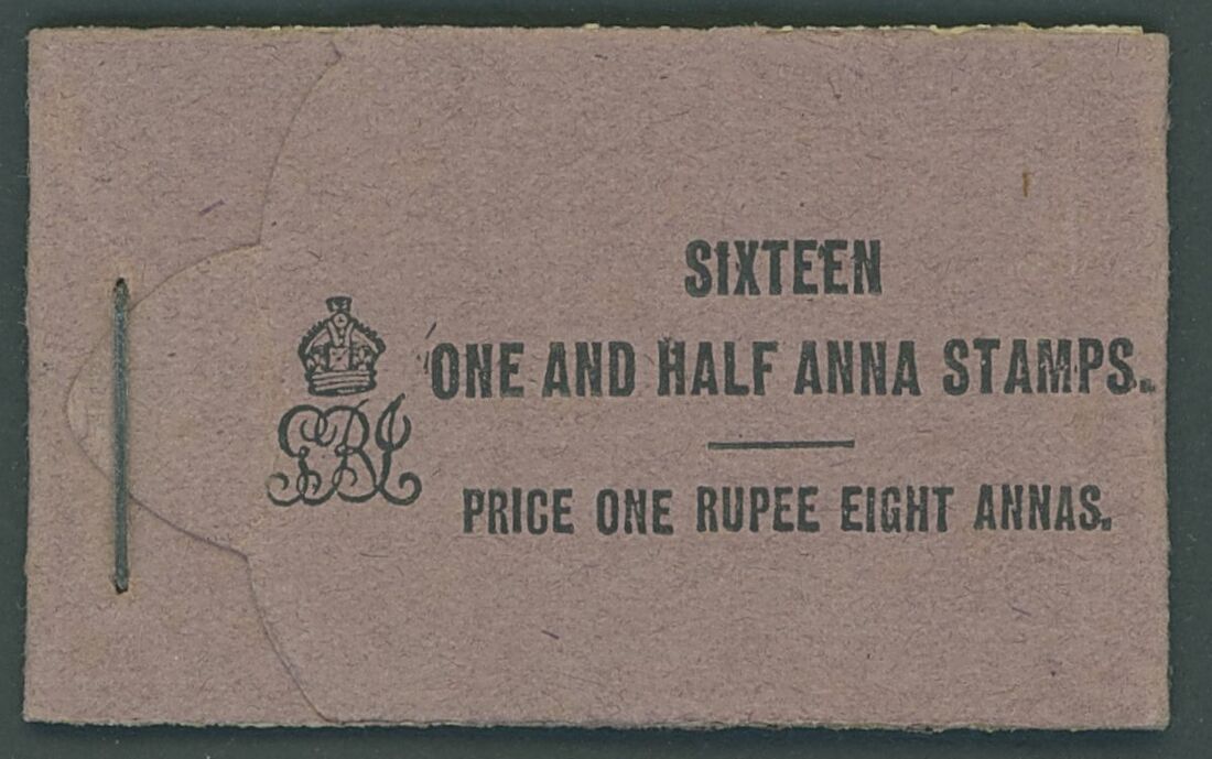 1912-22 1r.8a. black on purple with blank back cover, stapled at left, unexploded, containing 1½a. chocolate panes of four (4). Very fine and scarce. S.G. SB10a, £650.