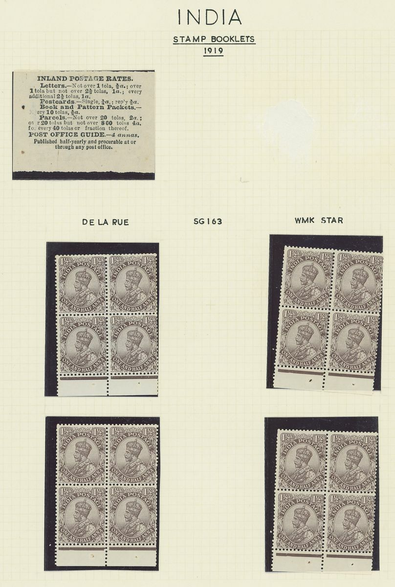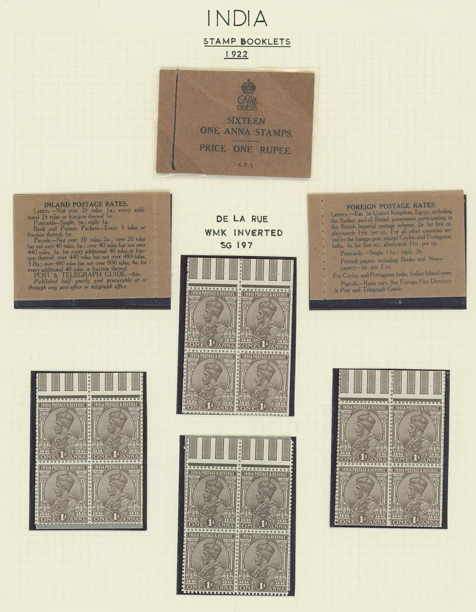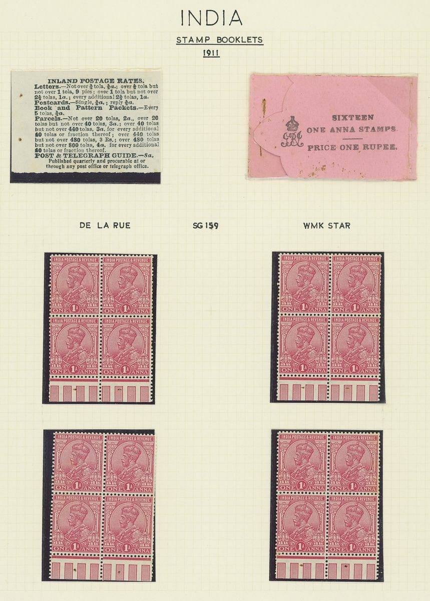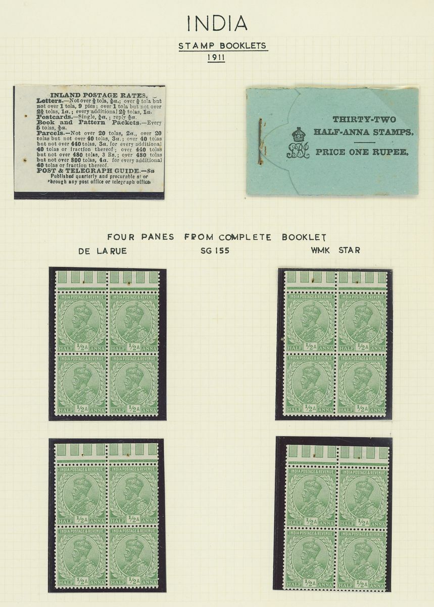 1907-26 selection arranged on eight written pages with 1907 1r. black on pink cover and three loose 1a. panes, 1912-22 1r. black on pink cover and four loose 1a. panes, 1912-22 1r. black on green partial booklet containing four panes plus additional four loose ½a. panes, 1912-22 2r. black on blue cover and four loose 2a. panes. Mixed condition, a difficult lot to assemble.