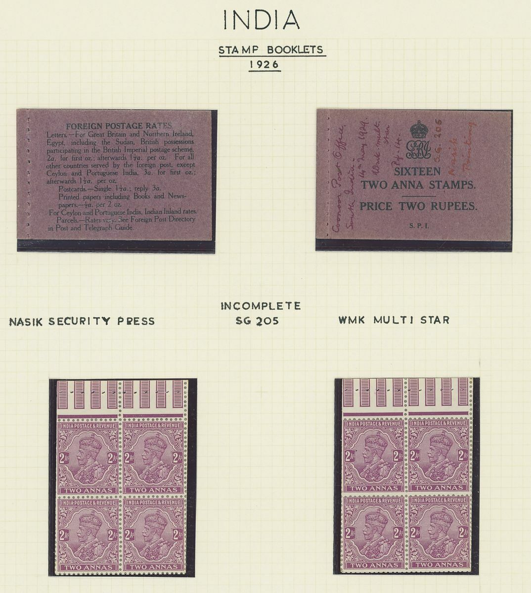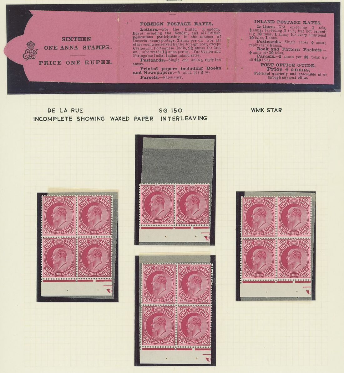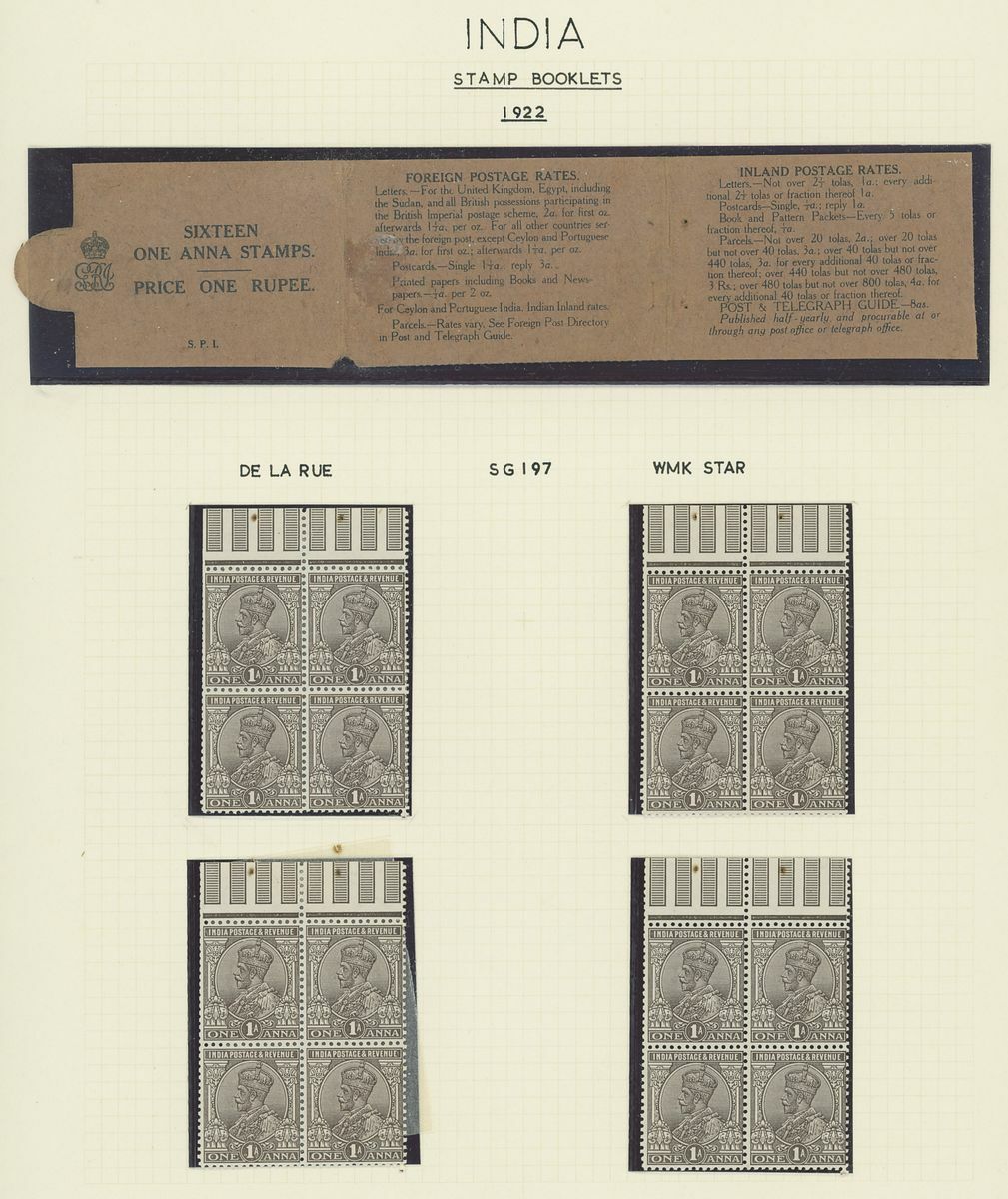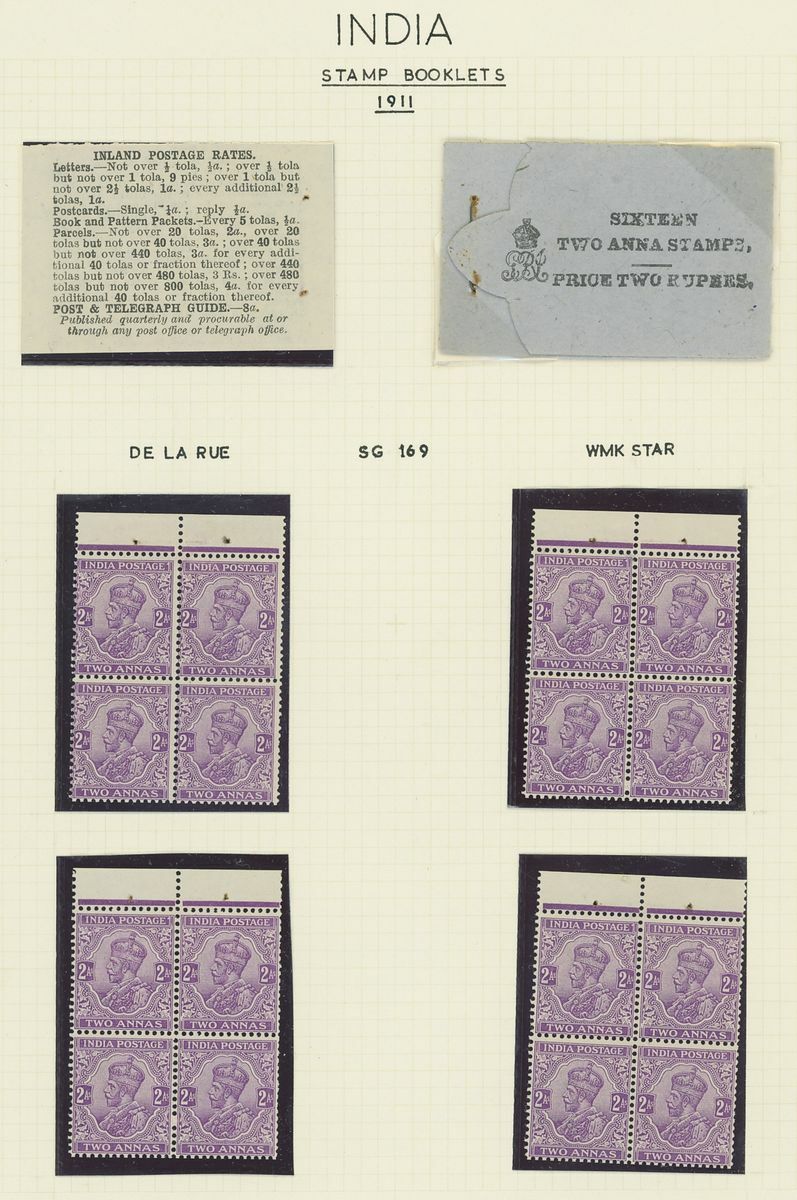1907-26 selection arranged on eight written pages with 1907 1r. black on pink cover and three loose 1a. panes, 1912-22 1r. black on pink cover and four loose 1a. panes, 1912-22 1r. black on green partial booklet containing four panes plus additional four loose ½a. panes, 1912-22 2r. black on blue cover and four loose 2a. panes. Mixed condition, a difficult lot to assemble.
