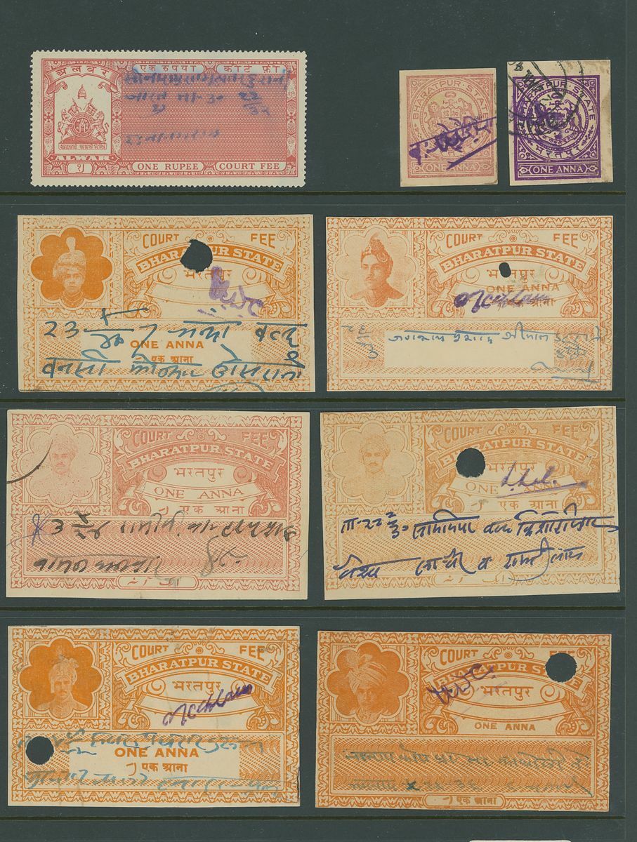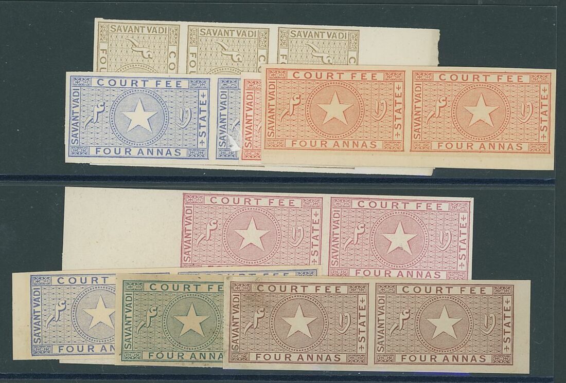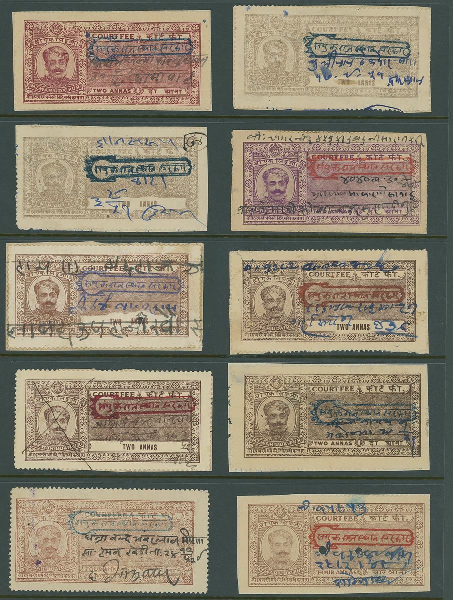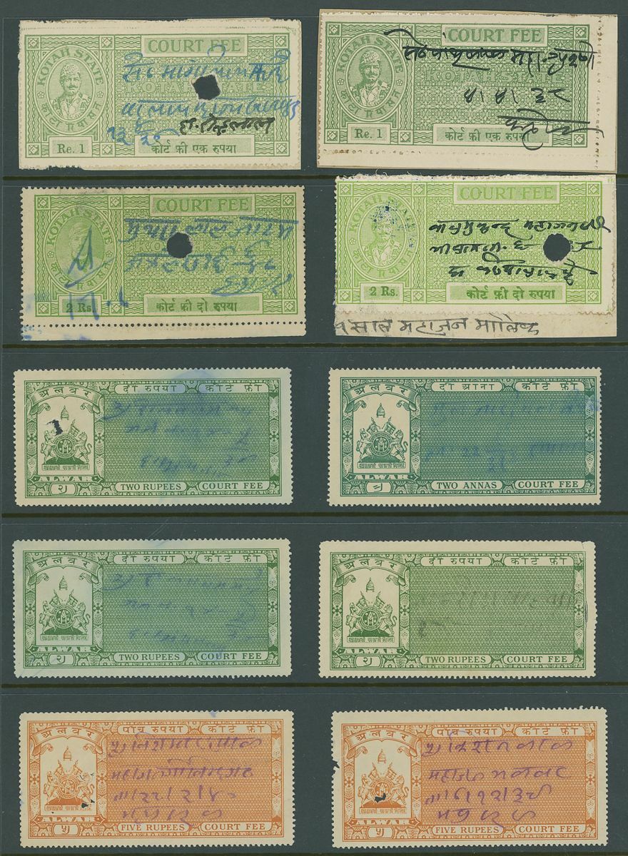 A collection of Court Fee papers on Hagners etc., including 1896 Savantvadi group of 4a. imperforate essays in pairs in various colours, followed by a large range of used Court Fee papers from various states including Kotah, Narsingarh, Jaipur, Indore, Jodhpur, Nabha, including used on documents, etc.