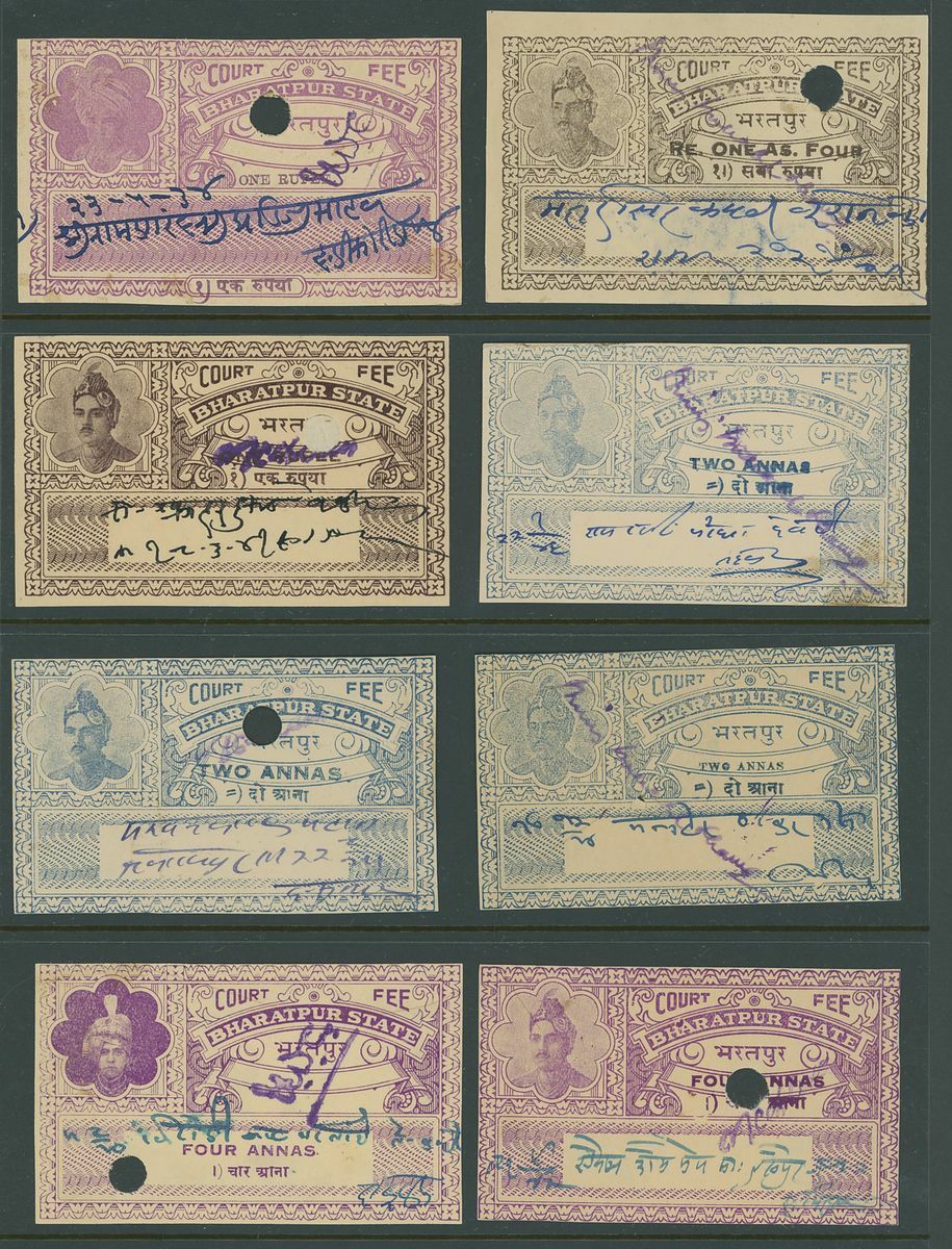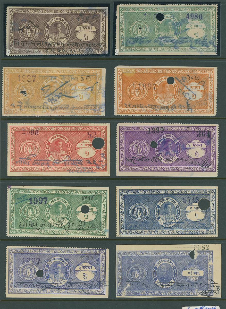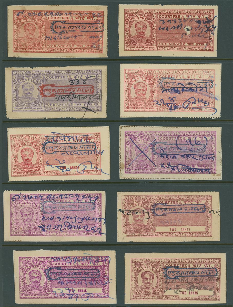 A collection of Court Fee papers on Hagners etc., including 1896 Savantvadi group of 4a. imperforate essays in pairs in various colours, followed by a large range of used Court Fee papers from various states including Kotah, Narsingarh, Jaipur, Indore, Jodhpur, Nabha, including used on documents, etc.