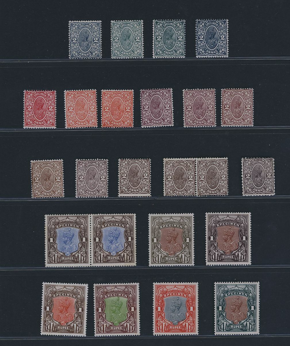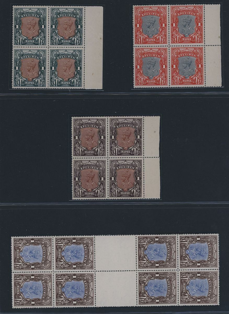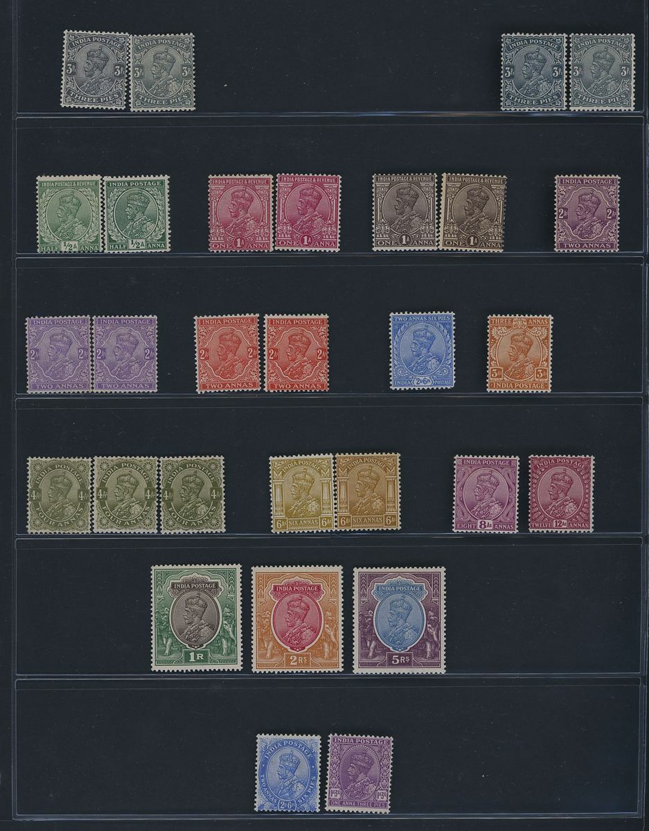 1911-25, a predominantly mint collection on stock pages including 1911-23 lower denominations, 1926-33 set of eighteen with additional 15r. and used 2r. to 25r., 1921 9p. on 1a. range with essay surcharges in blacks, issued in vertical strips, singles with double surcharge and 'inverts', 1922 ¼a. on ½a. blocks, one with 'inverted' surcharge, also 1925 Nasik Press New Delhi essays in blocks including 1r. blocks of four (3, in different colours) and interpanneau block of eight with singles; some toning though generally and a valuable group. Cat. c.£1,200+
