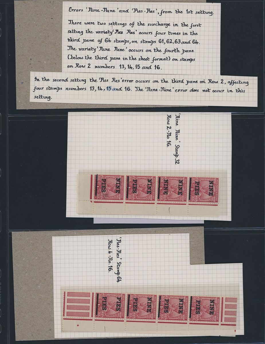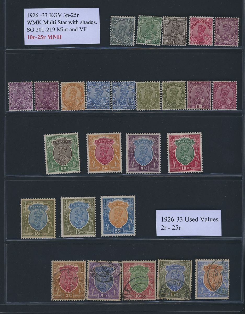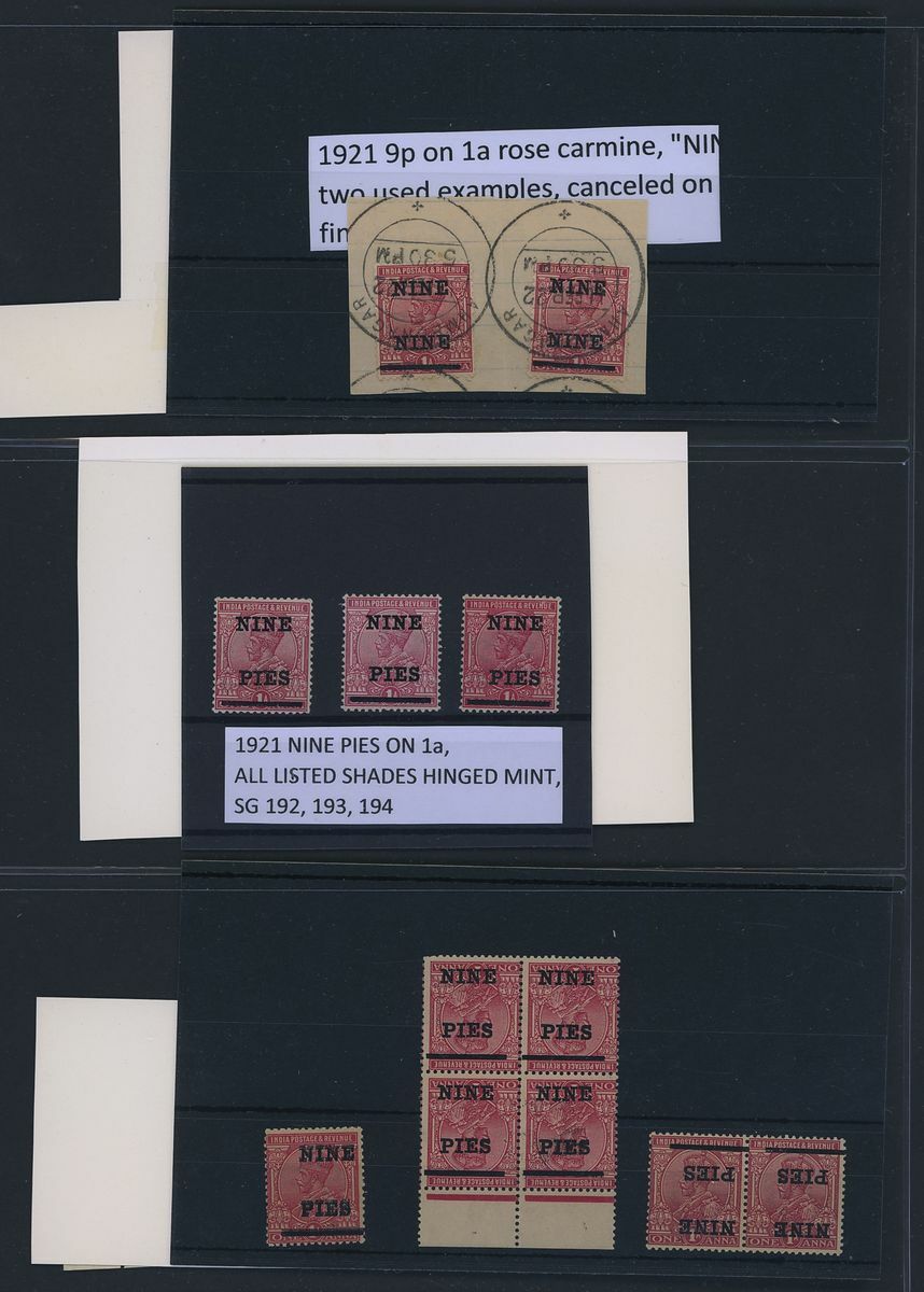 1911-25, a predominantly mint collection on stock pages including 1911-23 lower denominations, 1926-33 set of eighteen with additional 15r. and used 2r. to 25r., 1921 9p. on 1a. range with essay surcharges in blacks, issued in vertical strips, singles with double surcharge and 'inverts', 1922 ¼a. on ½a. blocks, one with 'inverted' surcharge, also 1925 Nasik Press New Delhi essays in blocks including 1r. blocks of four (3, in different colours) and interpanneau block of eight with singles; some toning though generally and a valuable group. Cat. c.£1,200+