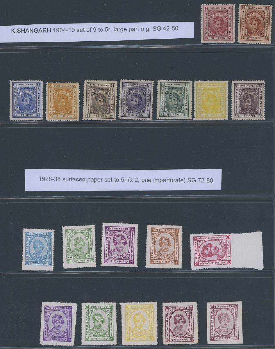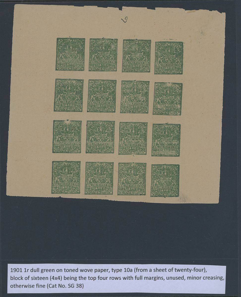 1901-47 mainly mint group on pages including 1901 1r. dull green block of sixteen, 1904 proofs, 1904-10 set of nine to 5r., 1r. green block of four and 2a. block of eight, 1928-36 set to 5r., some examples used on cover, some used and unused postal stationery, etc. generally good to fine