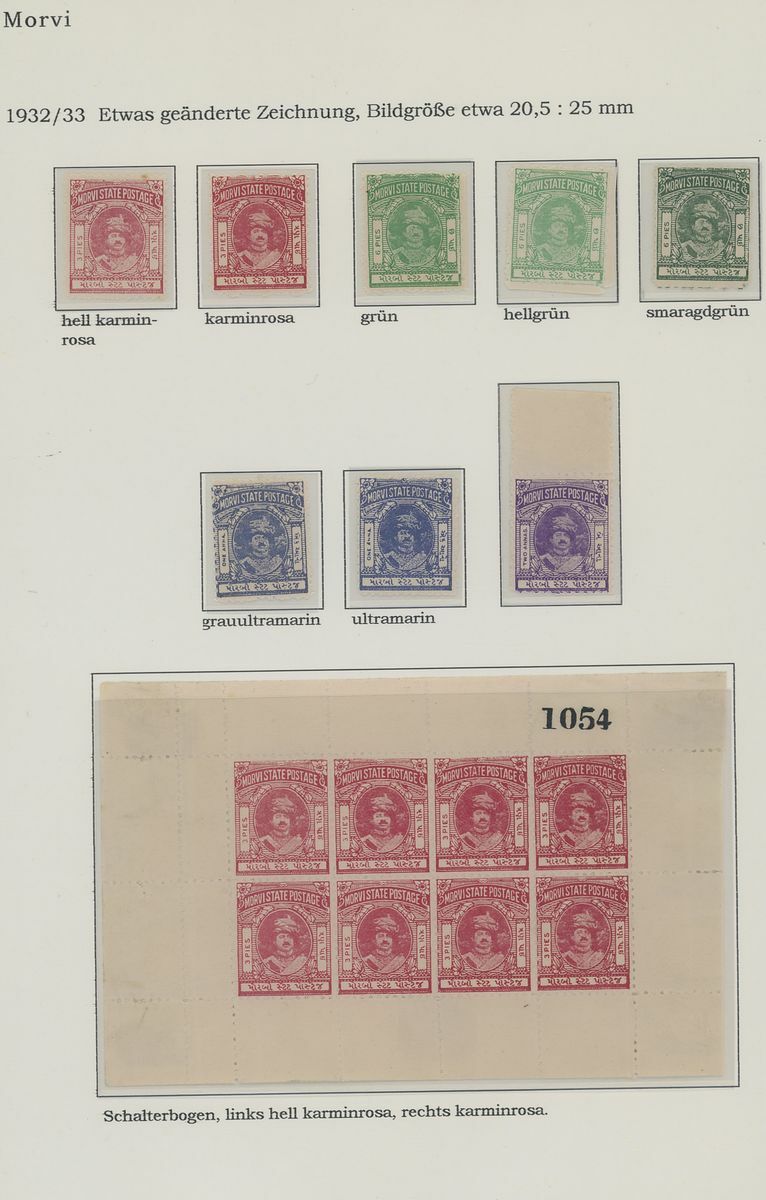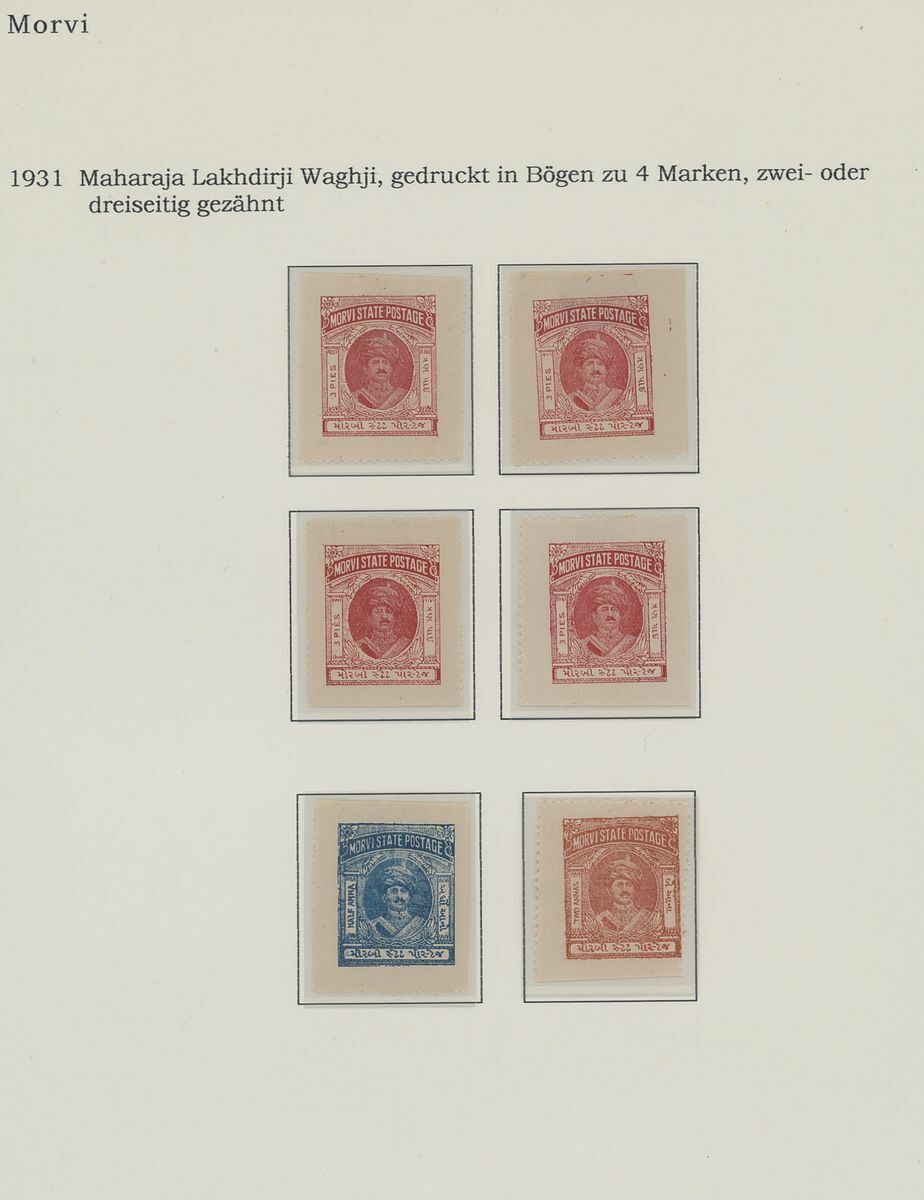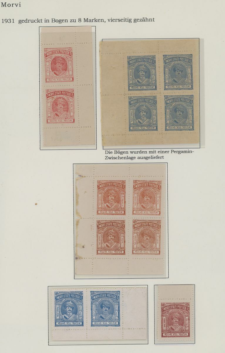 1931-48 mint and used collection on pages including 1931 (a) 3p. red (3), ½a. blue and 2a. yellow-brown unused, also (b) in multiples (½a. and 2a. in blocks of four), 1932-33 set to 2a. bright violet, 1934 set to 2a. bright violet, 1935-48 set to 2a. dull violet, 1935 3p. scarlet sheet of sixteen, some examples used on cover, postal stationery cards, 1890 Morvi State Steamer Service 5a. and 12a., etc.