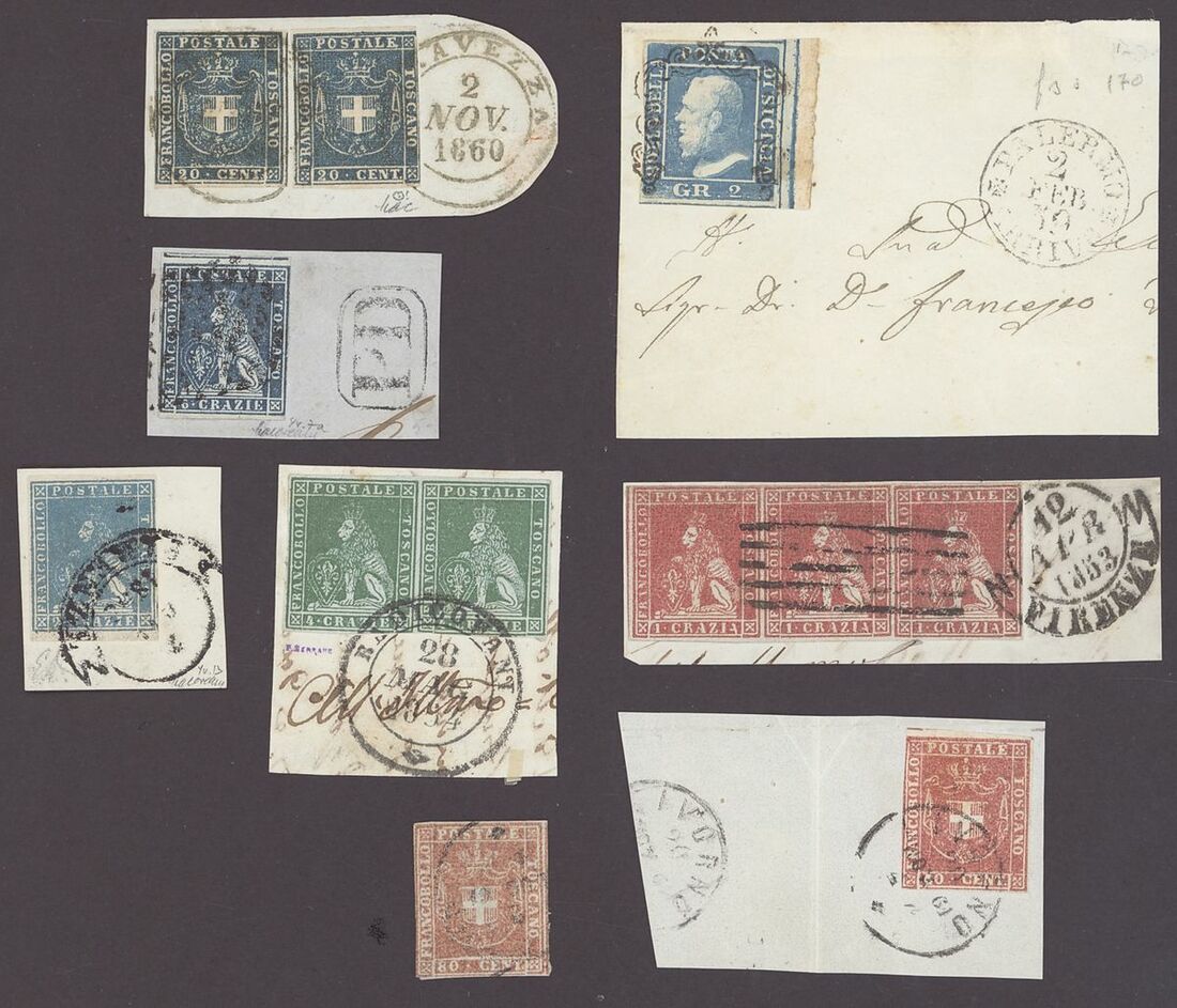 1851-52 1c. strip of three, 4c. pair and 5c., all used on separate pieces, 1860 Provisional Government 20c. (2) on piece, 40c. on piece and 80c. (Zanini Certificate 1974), also Sicily 1859 2c. on piece; chiefly good to fine