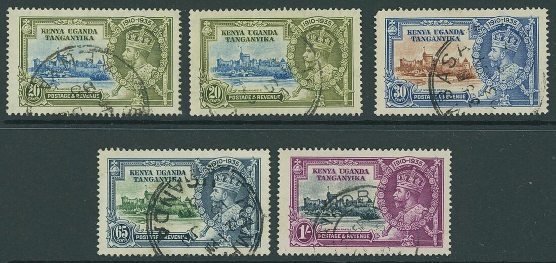 1935 Silver Jubilee variety used selection (5) including 20c. diagonal line by turret and dot by flagstaff, 30c. diagonal line by turret rounded top left corner, 65c. dot to left of chapel, 1/- line through '0' of 1910, generally fine. S.G. 124f, 124h, 125f, 126g, 127l, £1,095