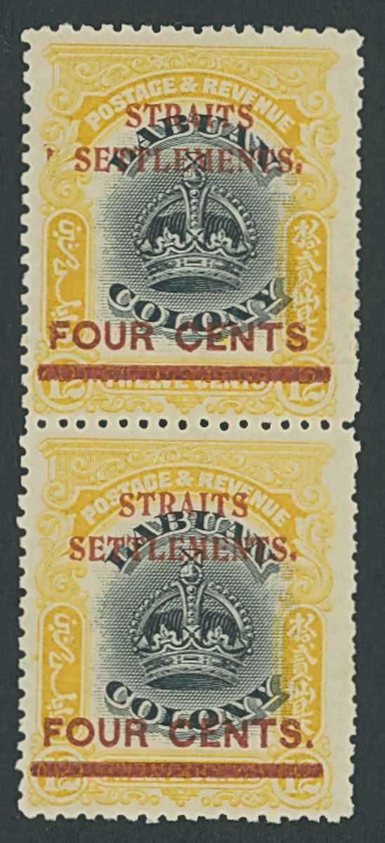 1906-07 4c. on 12c. black and yellow vertical pair [R1-2/8], the upper stamp with variety no stop after