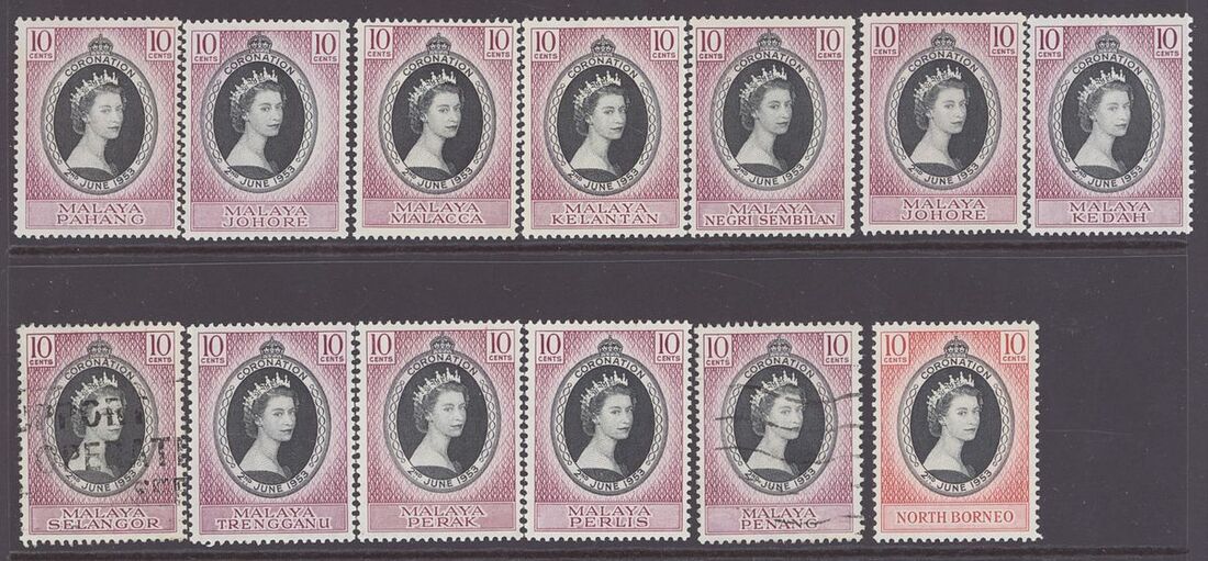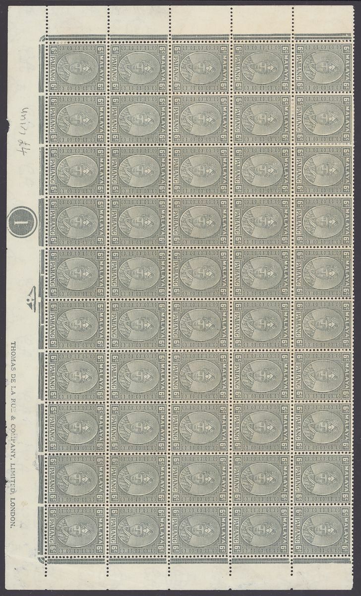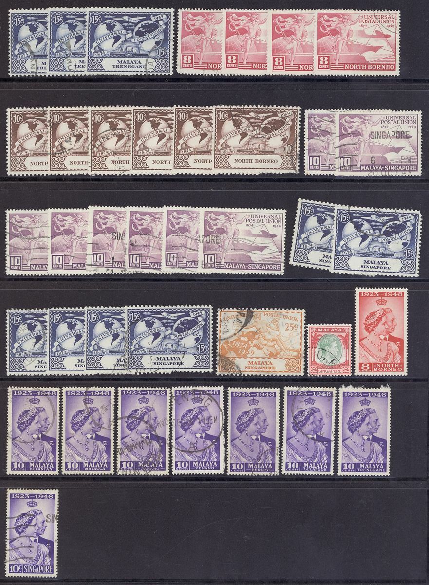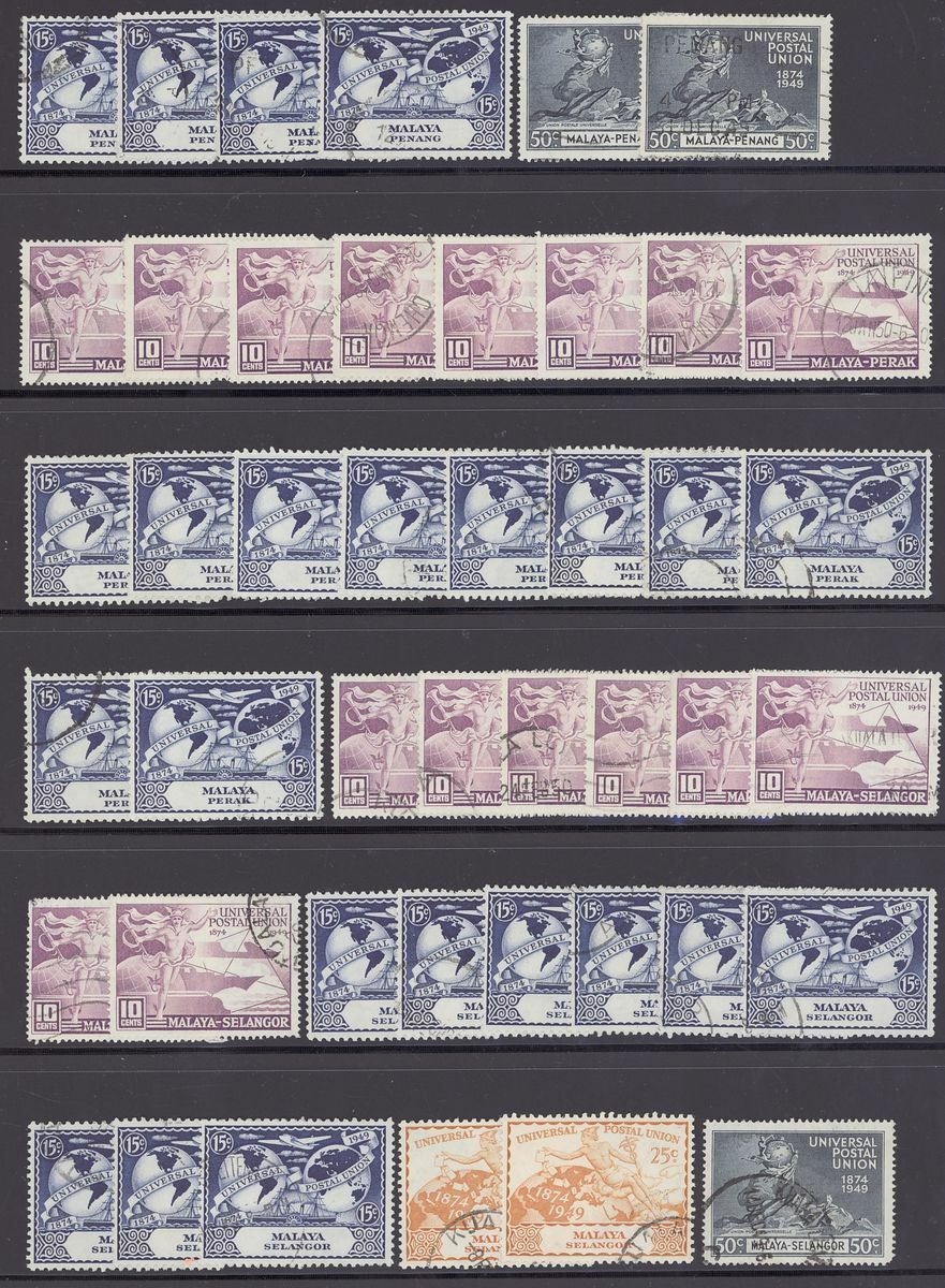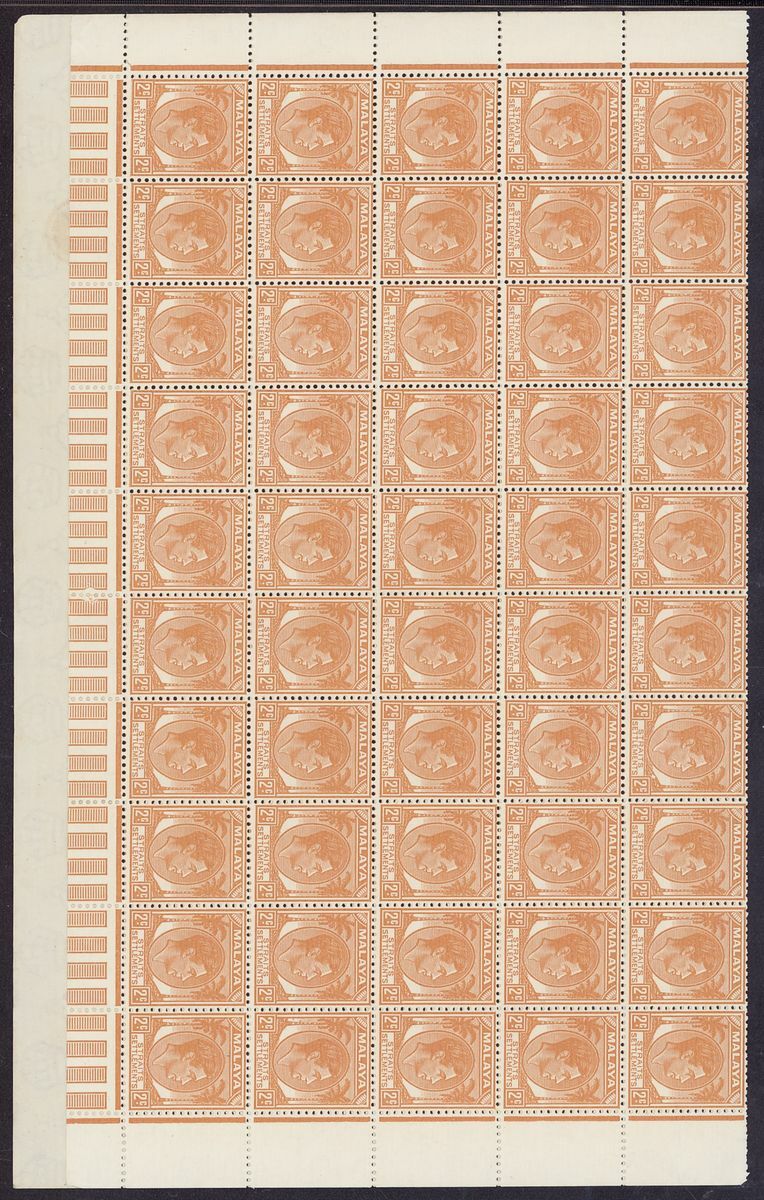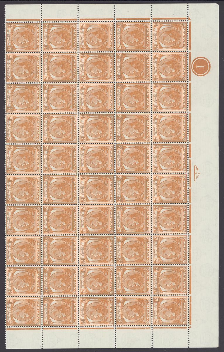 A small collection comprising Straits Settlements 1912-23 $25 fiscally used, 1937-41 2c. complete sheet and plate block of fifty, Federated Malay States 1922-34 $5 used, Malaya Postal Union Postage Due values including 1936-38 4c. green, 8c. scarlet pair, 10c. yellow-orange, 12c. corner marginal, 50c. and 1945-49 15c. mint, Johore Postage Due set, Pahang 1935-41 6c. plate block of fifty, Perak 1900 surcharges, various values in used blocks of four, States U.P.U. and omnibus values used. Mixed condition though a useful group. S.G. c.£3,000+